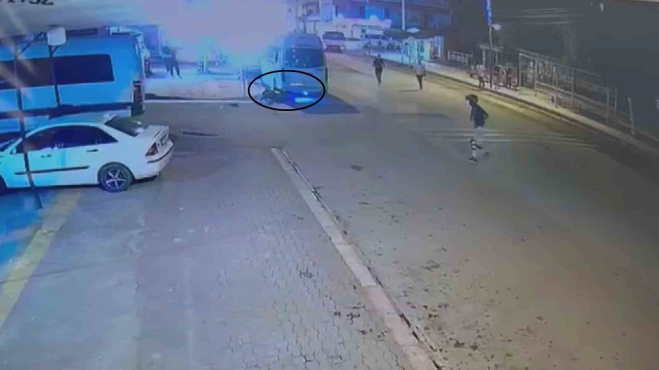 HATAY (İHA) - Hatay'da kontrolden çıkıp devrilen motosiklet sürüklenerek park halindeki minibüsün altına girdi. O anlar güvenlik kamerasına yansıdı.