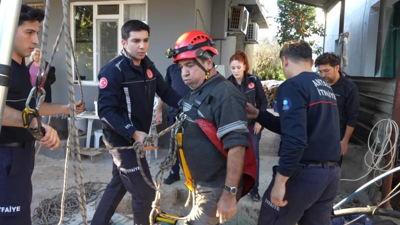 Olay, dün saat 15.30 sıralarında Konyaaltı ilçesi Kartepe Mahallesi Araplar Caddesi üzerinde yaşandı. Edinilen bilgiye göre, İhsan G. (62) dinamodaki arızayı gidermek için merdivenle yaklaşık 10 metre derinlikteki su kuyusuna indi. Burada problemini gideren İhsan G., ardından yukarı çıkmak istedi ancak kendini iyi hissetmedi. İhsan G., sesini yakınlarına duyurup durumu anlatınca 112 Acil Çağrı Merkezinden yardım talep edildi. İhbarın ardından bölgeye itfaiye ve jandarma ekipleri sevk edildi. Belirtilen adrese gelen itfaiye ekipleri, halatla bağladıkları İhsan G.’yi başarılı bir operasyonla yukarı çekti.