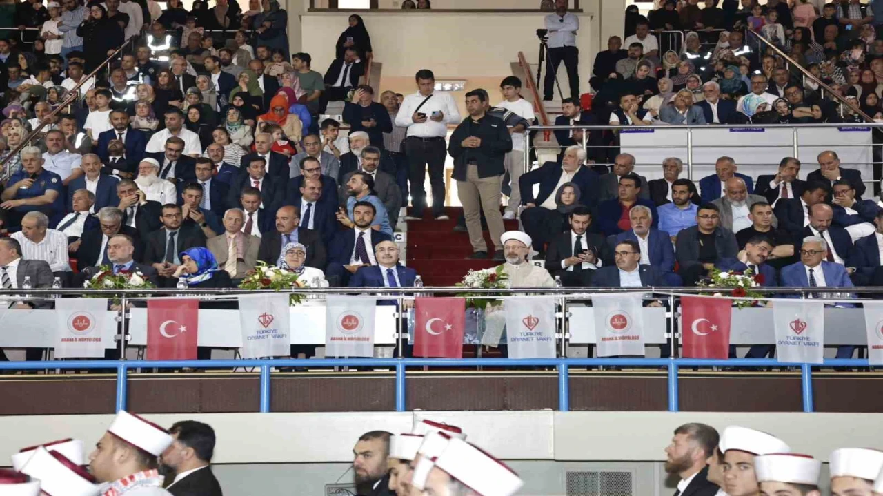 Burada konuşan Diyanet İşleri Başkanı Ali Erbaş, "En hayırlıların bulunduğu mekandayız. Kur’an’ı öğrenenler, öğretenler ve hafızlarımız burada. Farkında mısınız? Şuan da melekler yukarıda kanatlarını germişler, bizim için sağanak sağanak rahmet yağdırıyorlar. Hayırlı uğurlu olsun. Mücadelemizi Kur’an’ın yolunda yapıyoruz. Resulullah’ın yolunda mücadelemizi veriyoruz. Çünkü Resulullah’ın bize müjdesi, emaneti, vasiyeti var. O’nun vasiyetini yerine getiriyoruz. Peygamber Efendimiz Veda Hutbesi’nde ’Size iki şeyi emanet bıraktım. Bu iki şeye sarıldığınız sürece yolunuzu şaşırmazsınız. Bunlardan birisi Allah’ın kitabı diğeri de Resul’ünün sünneti’ buyuruyor. İşte Ya Resulullah, senin ümmetin olarak bu vasiyetine uyuyoruz, vasiyetini yerine getirmeye çalışıyoruz. İşte burada ümmetinin bir bölümü. 500’e yakın ümmetinin gençleri senin vasiyetini yerine getirdi" ifadelerini kullandı.