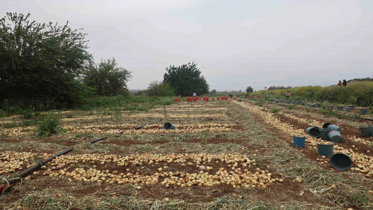 HATAY’IN BEREKETLİ TOPRAKLARI OLAN AMİK OVASI’NDA 150 DÖNÜMLÜK TARLADA SOĞAN HASADI DEVAM EDİYOR. KALİTE VE VERİMİN ÇOK İYİ OLDUĞU HASATTA SOĞAN, TARLADA 7 İLA 8 TL BANDINDA İKEN MARKETLERDE 20 İLA 30 TL ARASINDA DEĞİŞİYOR.