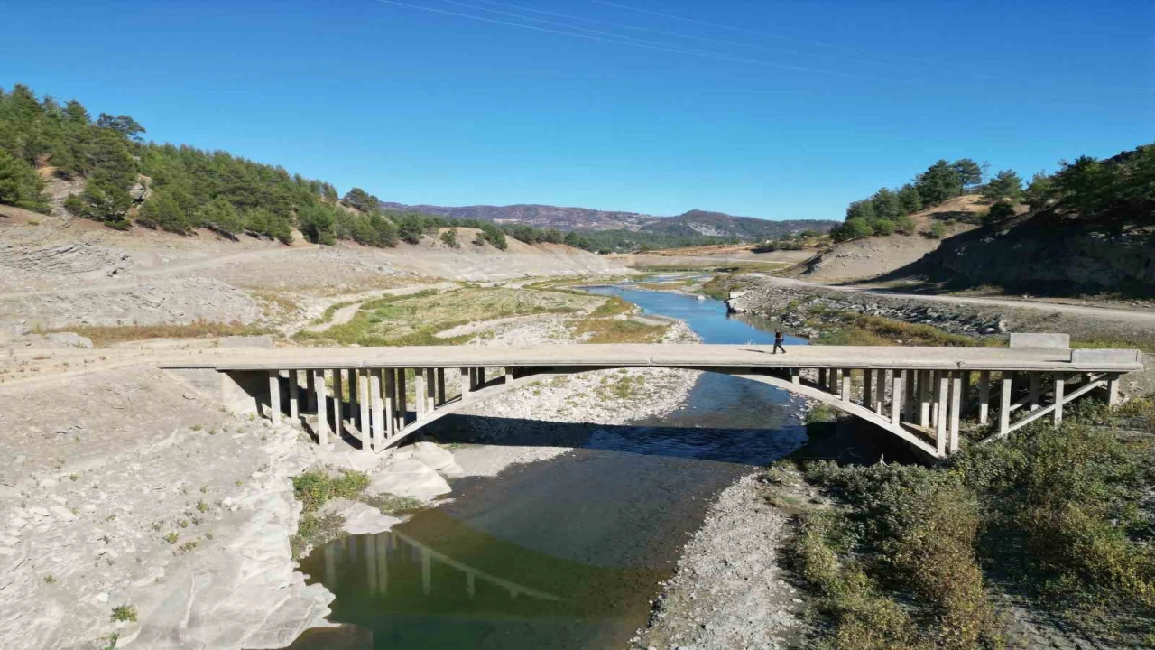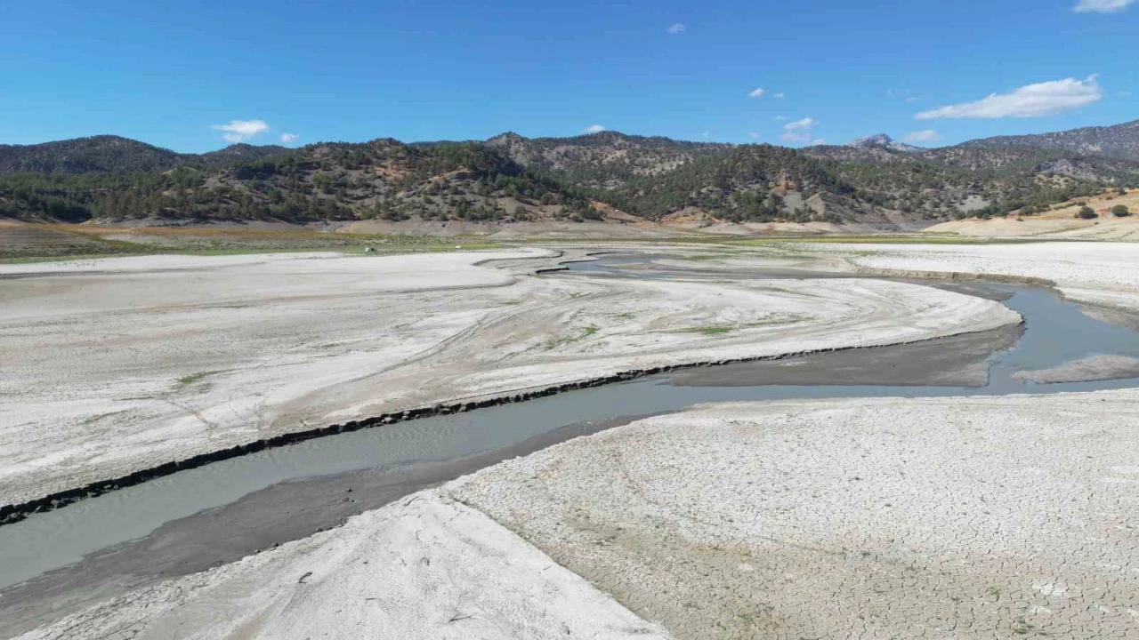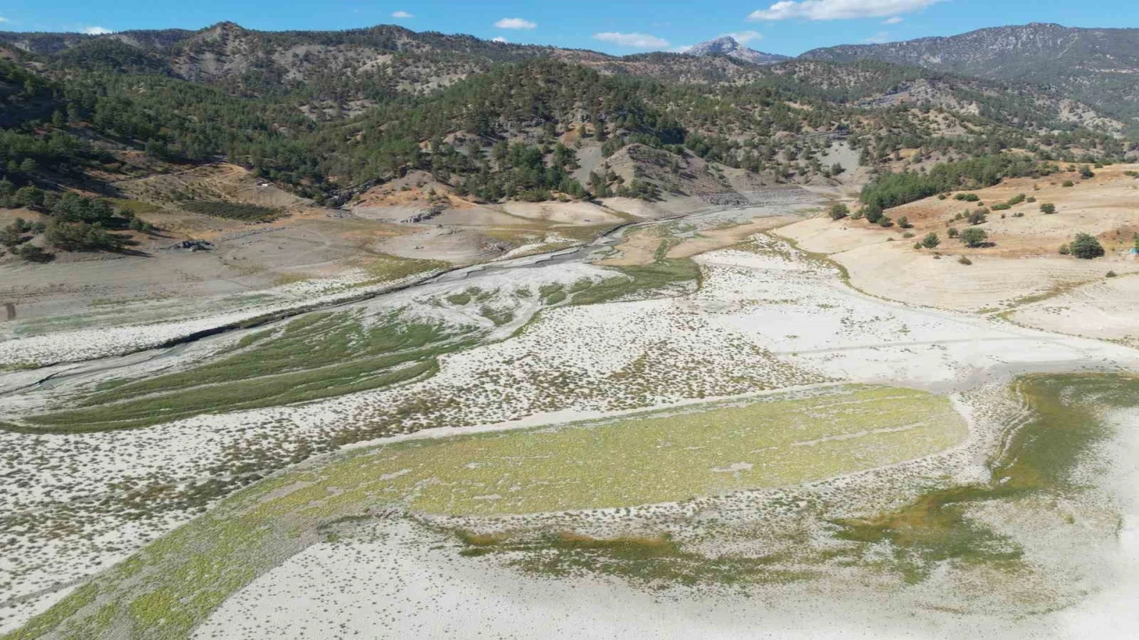 Kahramanmaraş’ta sıcak yaz mevsimi ve yağışların azlığı nedeniyle Menzelet Barajı’ndaki kuraklığın boyutu dron kamerasıyla görüntülendi. Suların çekildiği alanda yöre sakinlerinin ortaya çıkan arazide üretim yapması dikkat çekti.