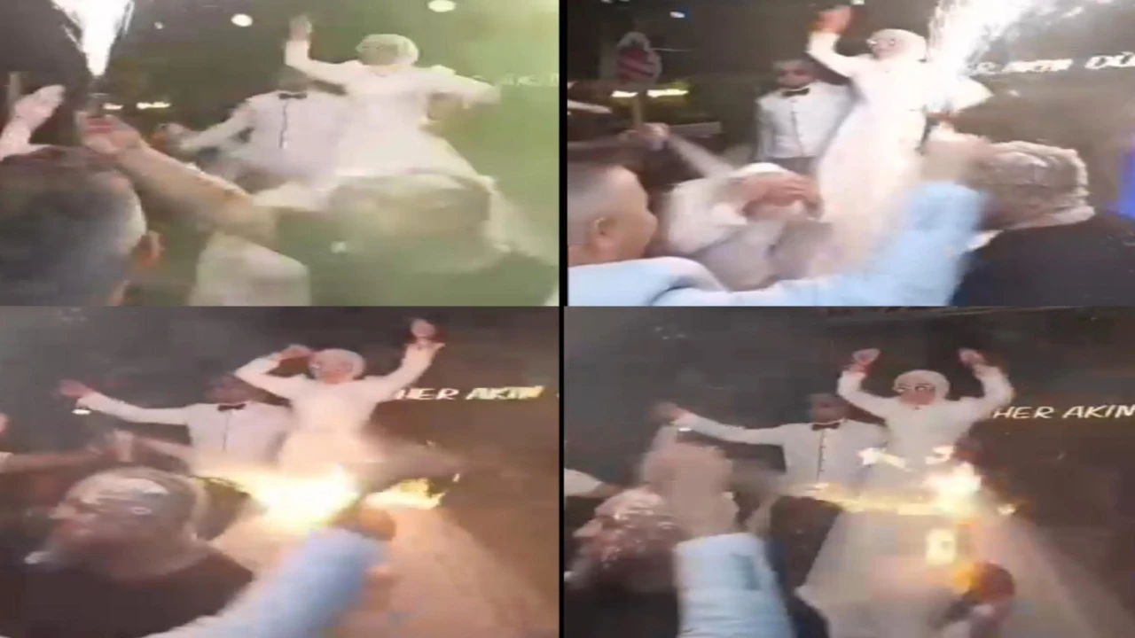 Mersin’in Silifke ilçesinde gerçekleştirilen düğün merasiminde yaşanan olay, konuklardan birinin cep telefonu kamerasına yansıdı. Sosyal medyada da paylaşılan görüntülerde, düğün merasimi sırasında düzenlenen eğlencede gelin ve damat pistte oynadığı sırada köpüklü ve meşaleli şov gerçekleştirildiği anlar yer aldı. Eğlence sırasında kafasına köpük sıkılan bir kişinin saçlarının, elde gezdirilen meşaleden sıçrayan kıvılcımlar nedeniyle alev aldığı anlar da görüntülere yansıdı. Kısa süreli paniğin yaşandığı olayda, saçları alev alan kişi alevleri eliyle söndürerek yanmaktan kurtuldu.