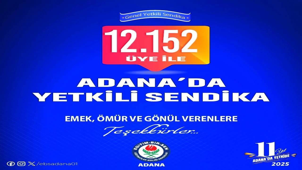 Eğitim-Bir-Sen Adana Şubesi, 2025 yılı mutabakatı sonuçlarına göre Eğitim-Öğretim ve Bilim Hizmetleri kolunda Adana’nın 15 ilçesinde yetkiyi perçinleyip, Çukurova’da yeniden yetkili sendika oldu. Konuyla ilgili bir açıklama yapan Şube Başkanı Mustafa Sarıgeçili; "Güç Birlikte, Zafer Bizimle düşüncesiyle mücadele ettik ve Adana’da ilk kez üye sayımız 12 bini aştı. 8 ayda sendikamıza 1531 yeni üye kazandırarak tarihî bir başarıya imza attık. Emeği geçen herkese teşekkür ediyorum" dedi.