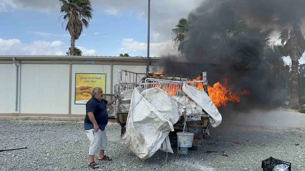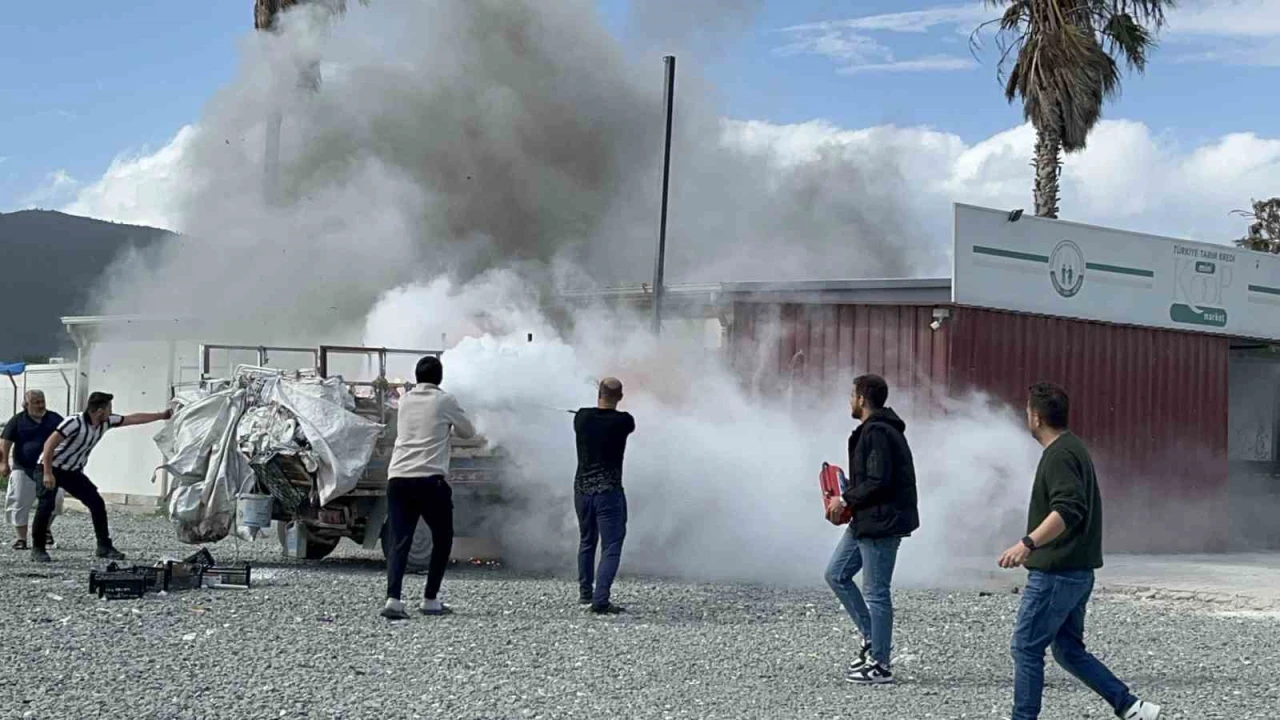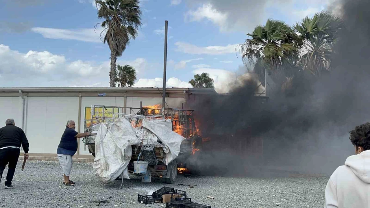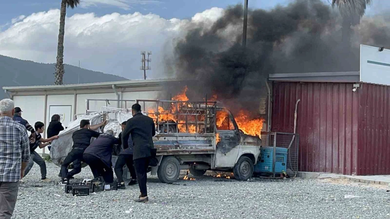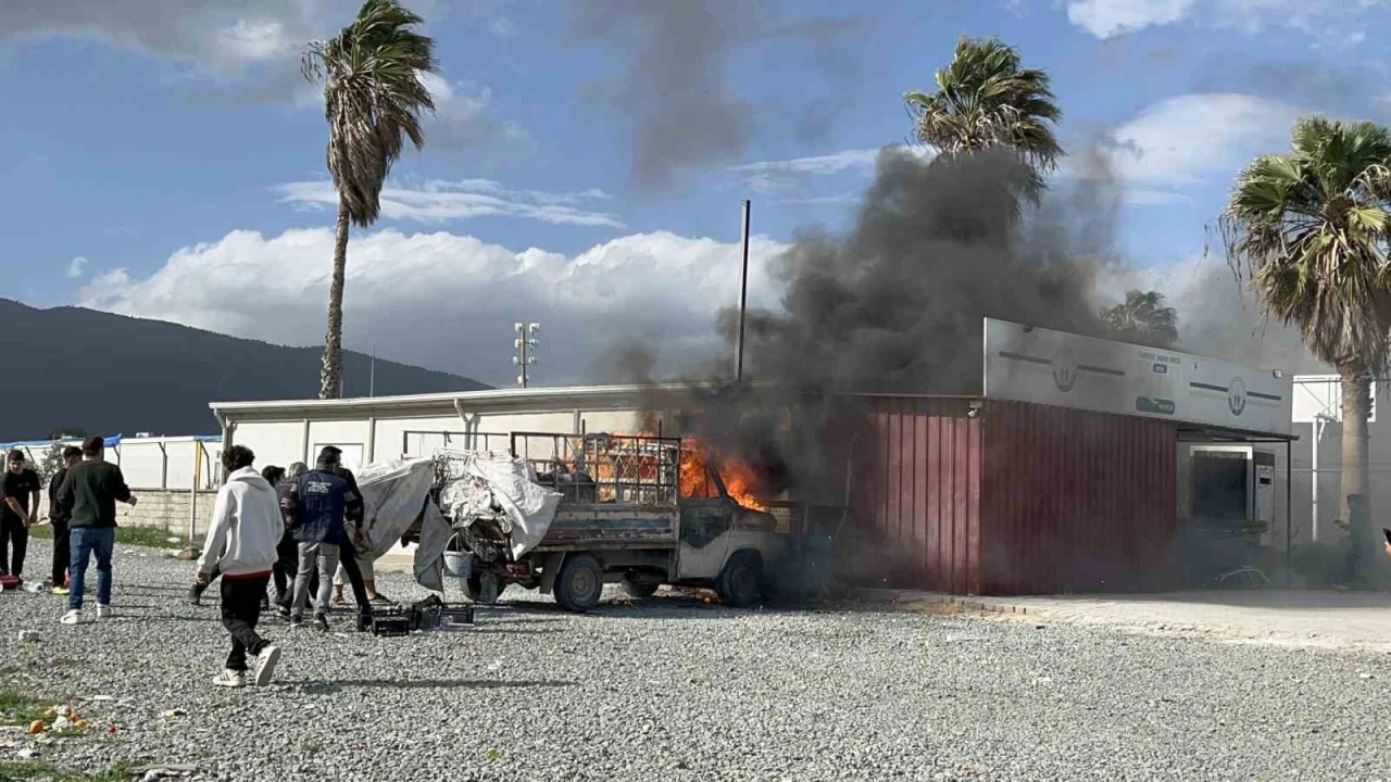 Yangın, Antakya ilçesi Büyükdalyan Mahallesi'nde yaşandı. Konteyner kentte yaşayan Yasin Yaraş isimli vatandaşa ait 31 DZ 439 plakalı park halindeki kamyonet bir anda alev aldı. Alevlere teslim olan kamyonet, Tarım Kredi Kooperatif marketine ait duvara çarparak durabildi.