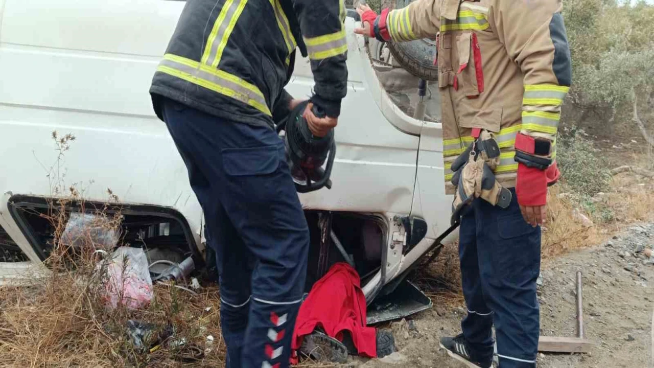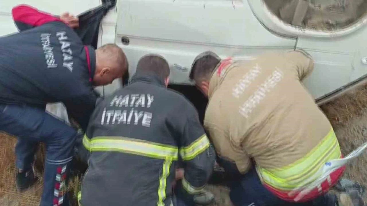 HATAY (İHA) - Hatay'da elektrik direğine çarpıp ters dönen minibüste sıkışan şoför ve yaralı şahıs itfaiye ekipleri tarafından kurtarıldı.
