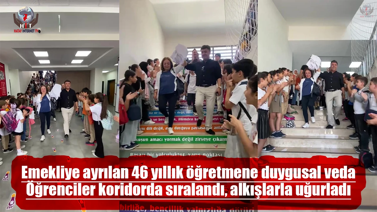 Hatay’da bir ilkokulda görev yapan 46 yıllık sınıf öğretmeni, öğrencilerinin gözyaşları ve alkışları eşliğinde emekliye uğurlandı. Okul koridorunda sıralanan yüzlerce öğrenci, öğretmenlerine unutulmaz bir veda yaşattı.