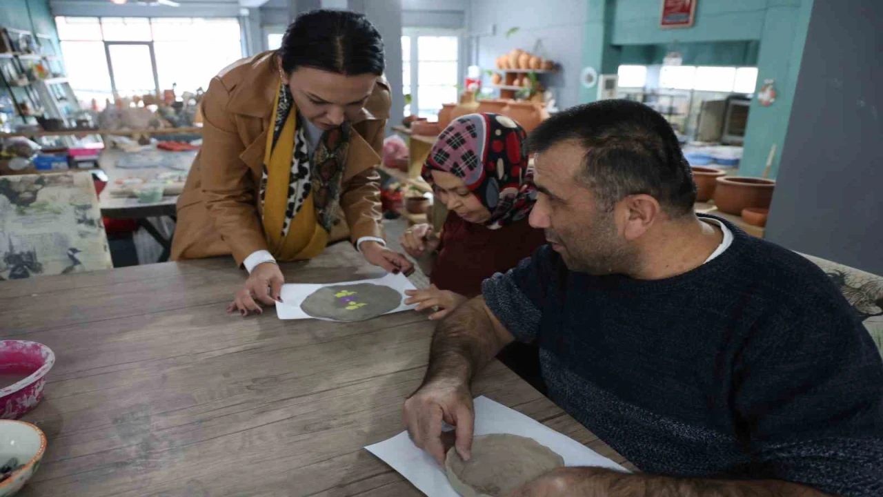 KOZAN BELEDİYESİ SERAMİK VE CERE ATÖLYESİNDE GÖRME ENGELLİLER, NERMİN ELMALI VE KOZAN BELEDİYE BAŞKAN YARDIMCISI ALEV ATAŞ İLE BİR ARAYA GELDİ.