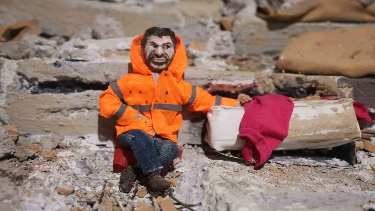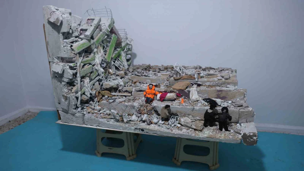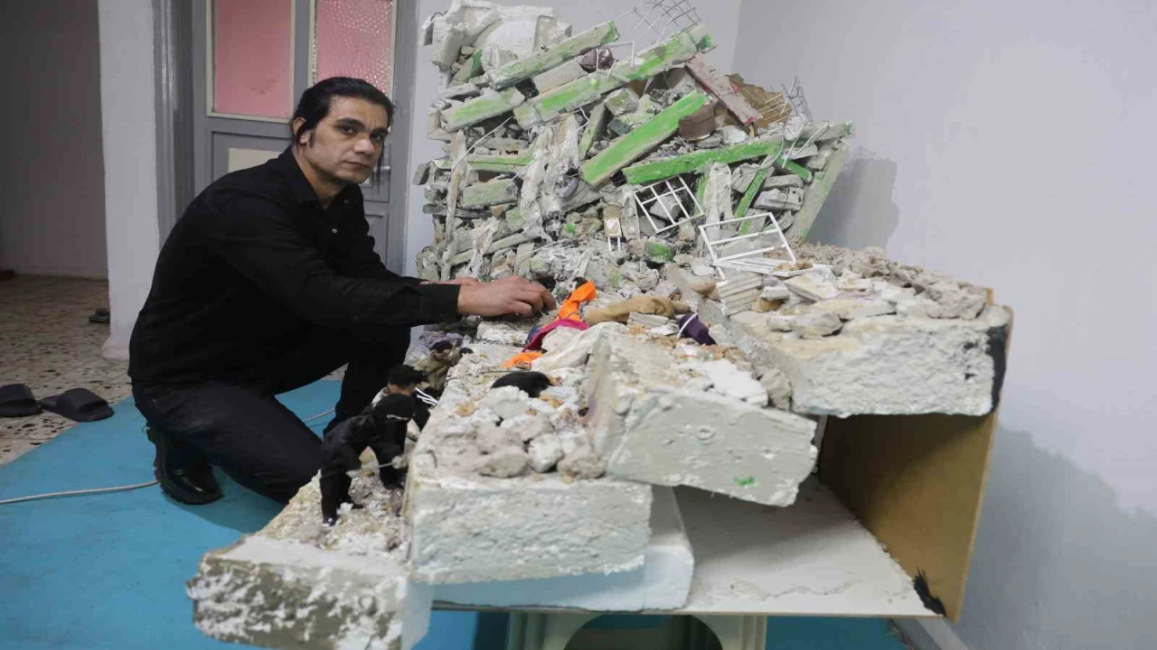 HATAY (İHA) - Hatay'da asrın felaketinde kız kardeşini kaybeden ve iki çocuk babası olan 47 yaşındaki Mehmet Kocaman, Kahramanmaraş'ta depremde enkaz altında kalan evladının elinden tutan ve bir an kızının elini bırakmayan Mesut Hançer'den etkilenerek 3 ay süren çalışmayla deprem minyatürü yaptı.