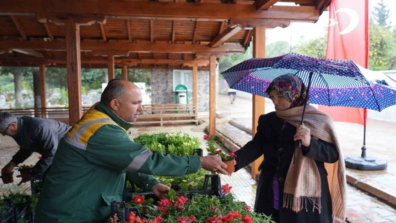 Mersin’in Erdemli Belediyesi, Ramazan Bayramı dolayısıyla mezarlıkları ziyaret eden vatandaşlara kabirlere dikmeleri için ücretsiz çiçek dağıttı.