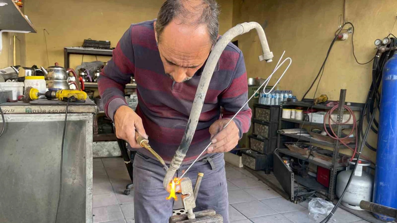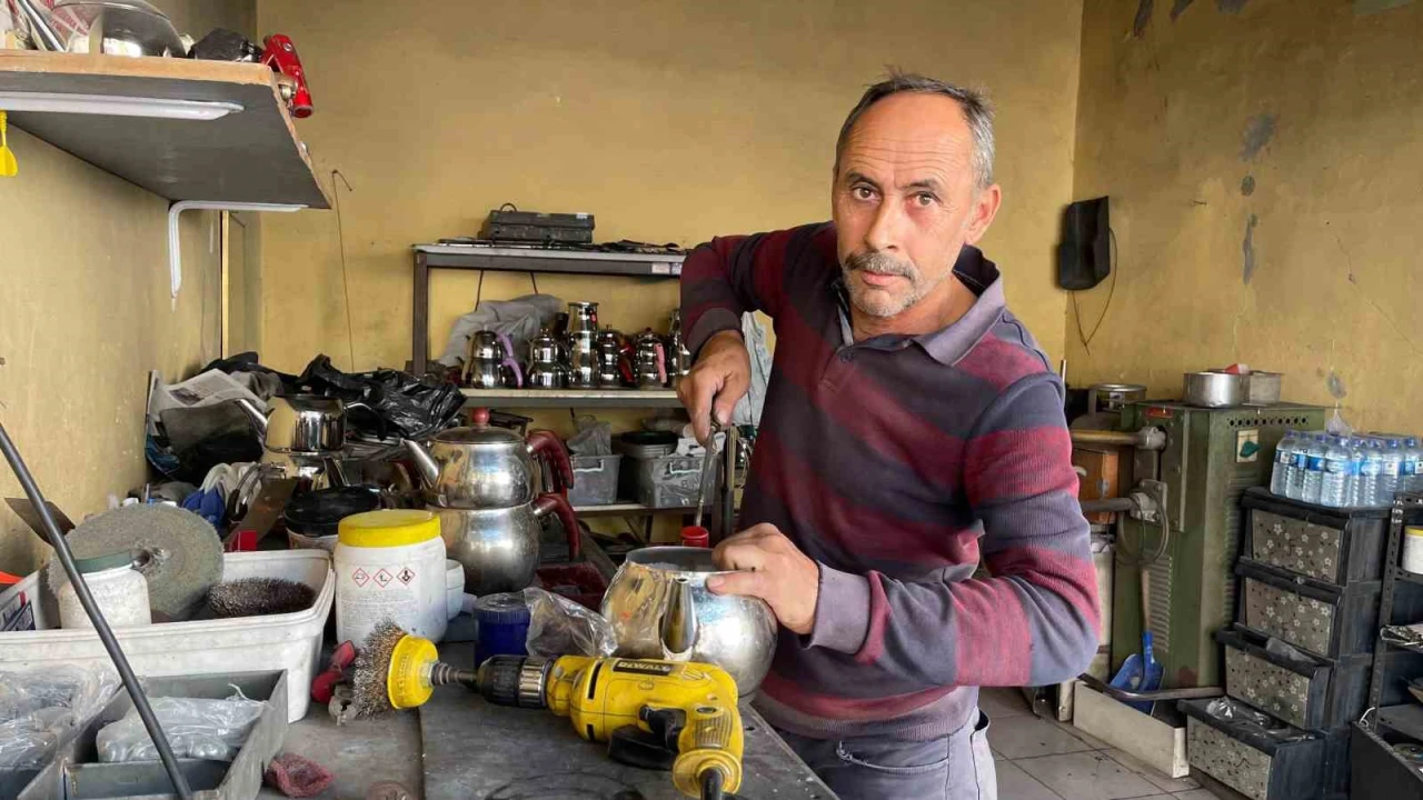 Osmaniye’de 45 yıldır eskiyen tencere, tava ve çaydanlık tamiri yapan Sayim Çıtacı, mutfak eşyalarının ömrüne ömür katıyor.