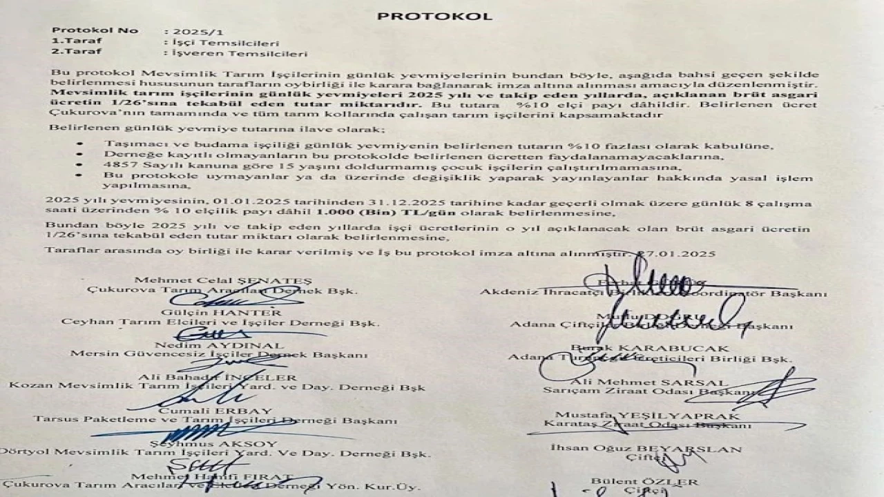 Konuyla ilgili Yüreğir Ziraat Odası Başkanı Mehmet Akın Doğan, İhlas Haber Ajansı’na açıklamalarda bulundu. Doğan, "Valimizin başkanlığında Tarım İl Müdürlüğü, ziraat odaları, aracılar ve işçiler olarak toplanıp protokol hazırlıyoruz. Bu anlaşmanın başlangıç tarihi 01.01.2025-31.12.2025 tarihine kadar fiyatlar belirleniyor. Ne zaman Cumhurbaşkanımız asgari ücrete zam yaparsa biz de bu fiyatları arttırırız. Geçtiğimiz yıllarda tarım işçileri brüt asgari ücretin 30’da 1’ini alırlarken artık 26’da 1’ini almaya başladılar. Şu anda işçinin eline bin TL para geçiyor. Yüzde 10’unu aracılar alıyor" ifadelerini kullandı.