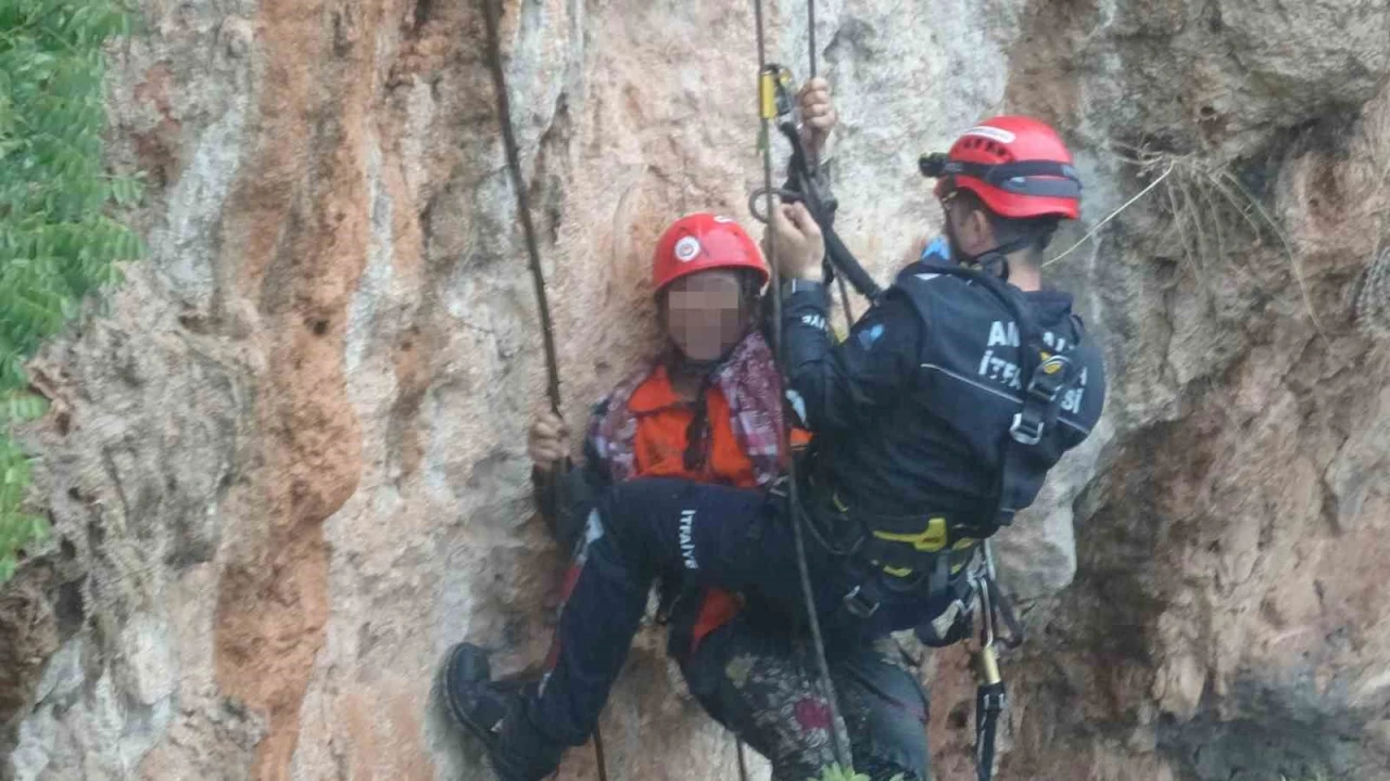 Antalya’da indiği falezlerden yağış nedeniyle geri çıkamayan kadın mahsur kaldı. İtfaiye ekipleri tarafından halat yardımıyla yukarı çekilen kadın kurtarıldı.