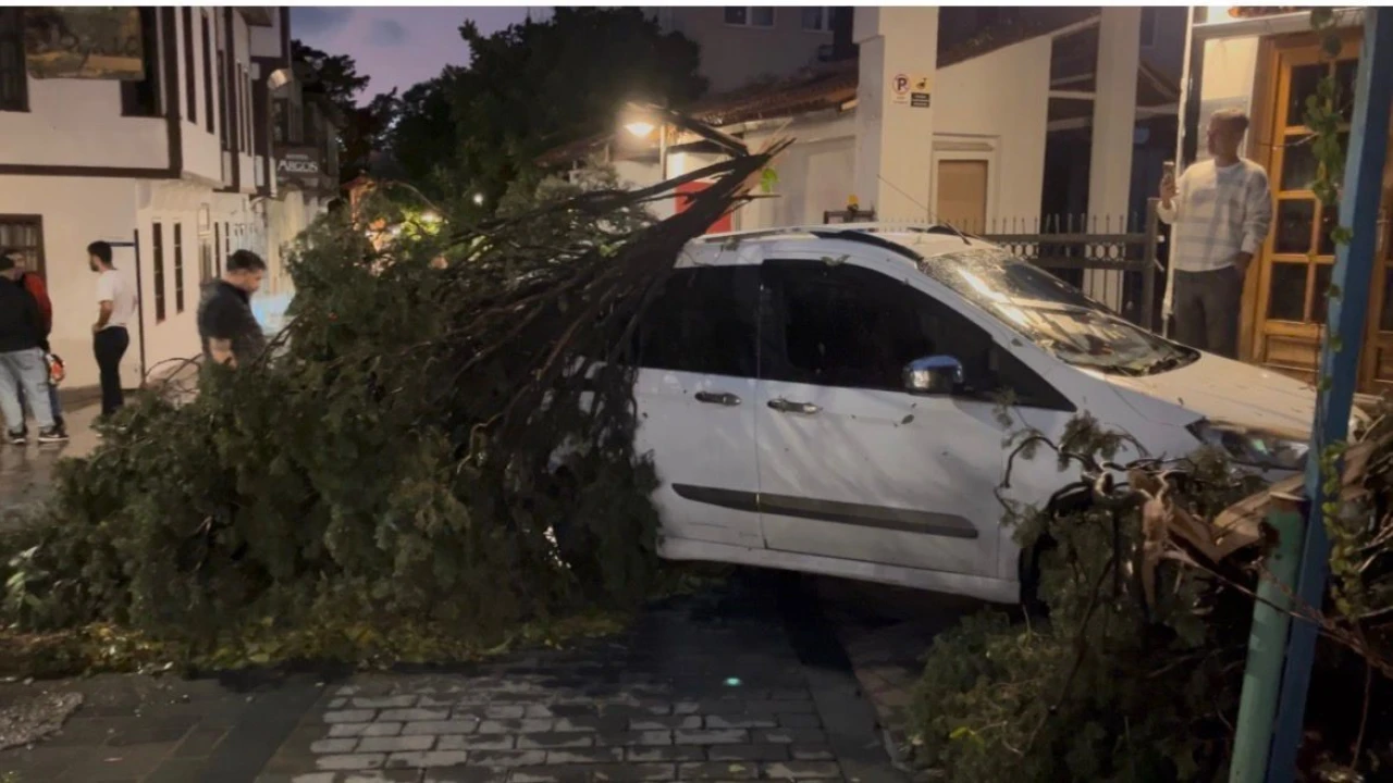 Olay, Muratpaşa ilçesi Tuzcular Mahallesi Balıkpazarı Sokak’ta meydana geldi. Akşam saatlerinde dolu karışımlı şiddetli yağış ve fırtınanın etkisiyle sokakta bulunan bir çam ağacı kökünden kırılarak, park halindeki hafif ticari aracın üzerine düştü.