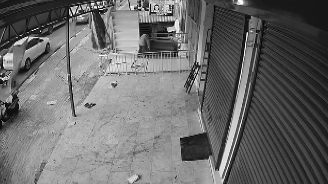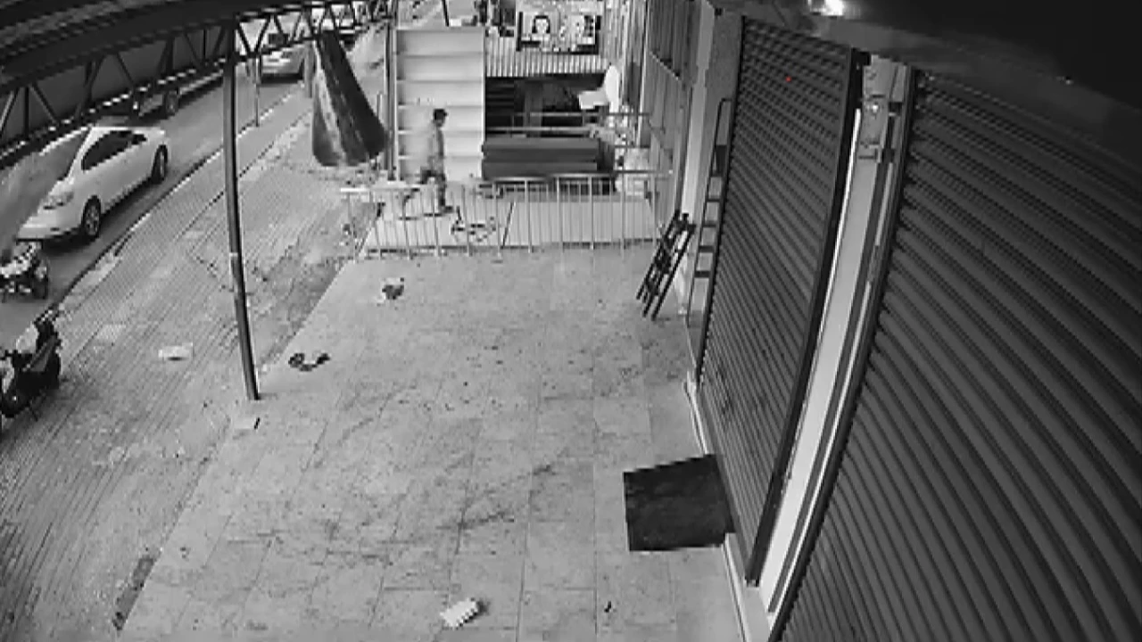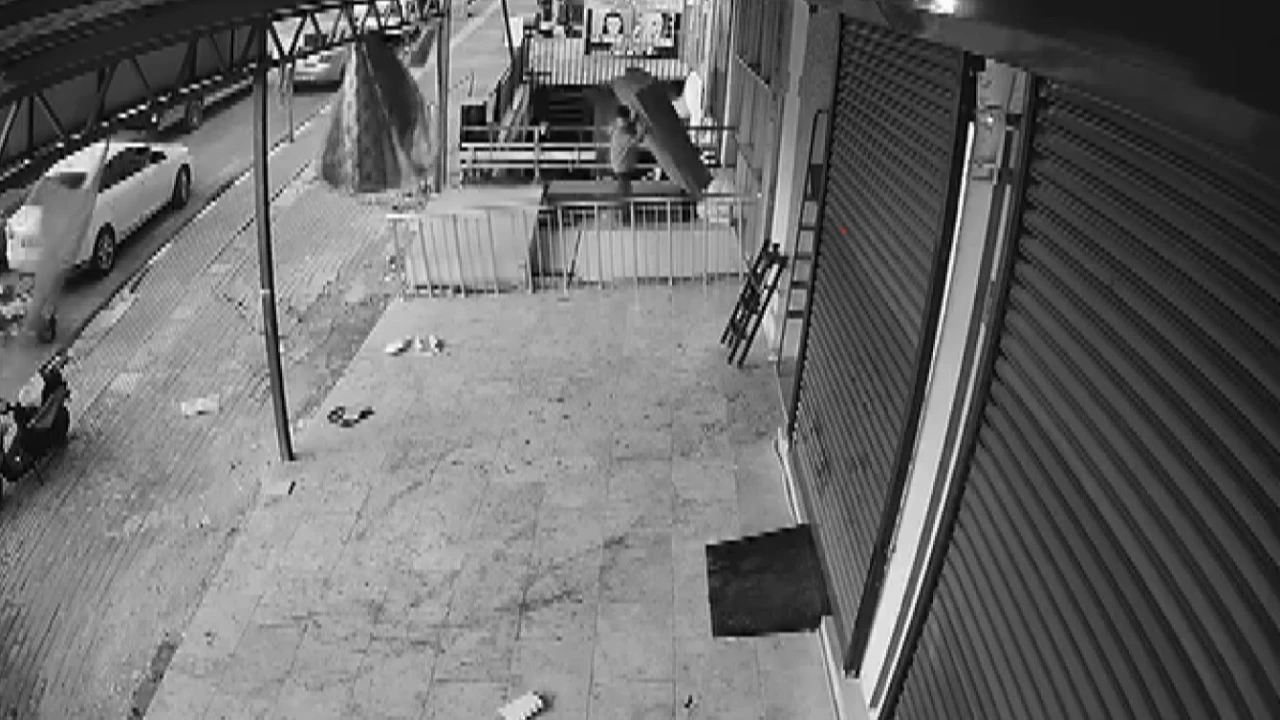 HATAY (İHA) - Hatay'da bir iş yerinin önünde bulunan rafın fırtınanın etkisiyle devrildiği esnada rafın altında kalmaktan saniyelerle kurtulan çocuğun o anları kameraya yansıdı.
