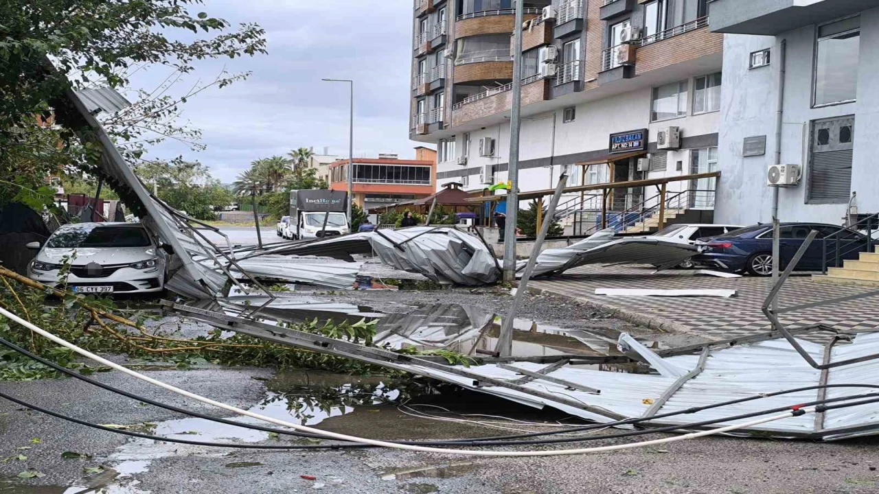 Öte yandan, ilçedeki bir binanın çatısının uçtuğu anlar ve Dörtyol Numuneevler Mahallesi'nde belediyeye ait konteyner ekmek büfesinin kuvvetli fırtınada devrildiği anlar kameraya yansıdı.