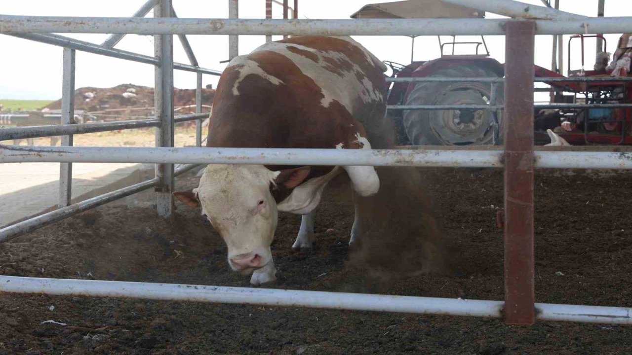 Reyhanlı ilçesi Yeşilova Mahallesi’nde besicilik yapan çiftçi İbrahim Yumuşak, dededen kalan besicilik mesleğini devam ettirerek ata mesleğini sürdürüyor. Hayvanları ve işini severek yapan Yumuşak, çiftliğinde 150 büyükbaş ve 8 bin küçükbaş hayvanıyla kurban bayramına hazırlanmış durumda. Besici Yumuşak’ın çiftliğin ’kralı’ ve ’babası’ olarak ifade ettiği 4 yaşındaki, bin 400 kilo ağırlığa sahip tosunsa onlarca hayvanın içerisinde çiftliğin gözdesi konumunda. Görenlere ’Maşallah’ dedirten devasa tosun 420 bin TL’lik fiyatıyla alıcılarını bekliyor. Tosunu görmek için farklı bölgelerden vatandaşların çiftliğine geldiğini söyleyen Yumuşak, vatandaşların hayvanı gördüklerinde cüssesinden ve fiyatından dolayı ürktüklerini söyledi.