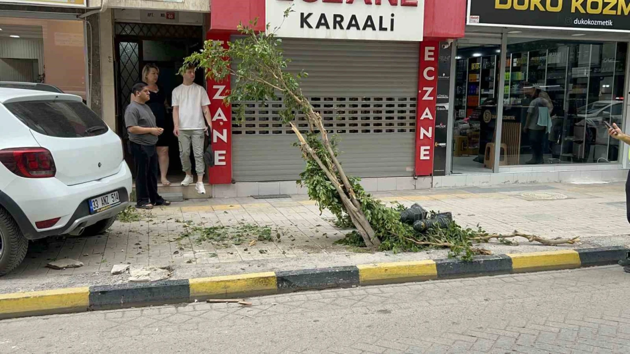 Olay saniye saniye güvenlik kamerasına yansıdı. Kaldırıma çıkan araç; elektrikli bisikleti, dubaları ve ağaçları devirdi.