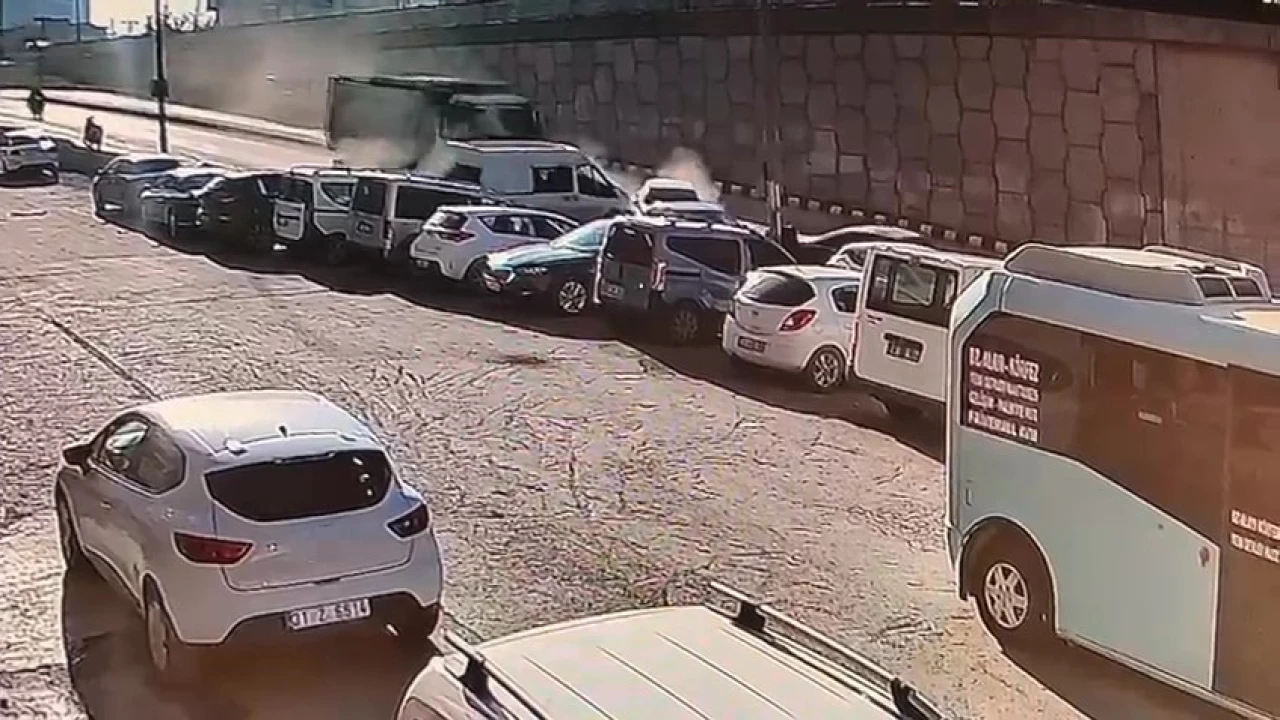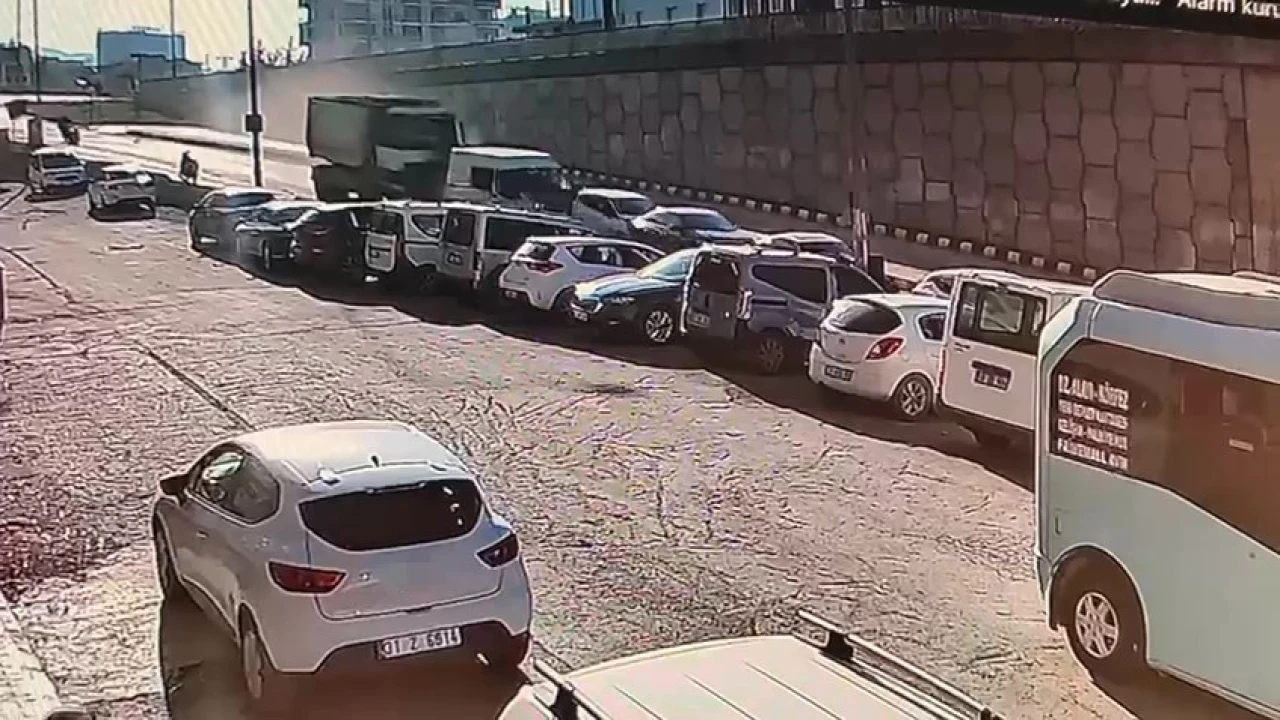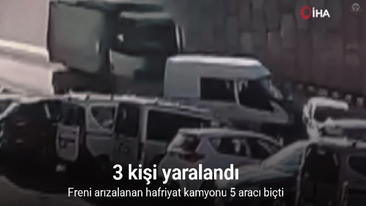 Edinilen bilgiye göre, M.N.A. idaresindeki 07 MSG 16 plakalı hafriyat kamyonu seyir halindeyken fren sisteminde arıza yaşandı. Yokuş aşağı inerken freni patlayan kamyon, kavşakta bekleyen 5 aracı biçti. Kazada 3 kişi yaralanırken feci kaza anı anbean güvenlik kamerasına yansıdı.
