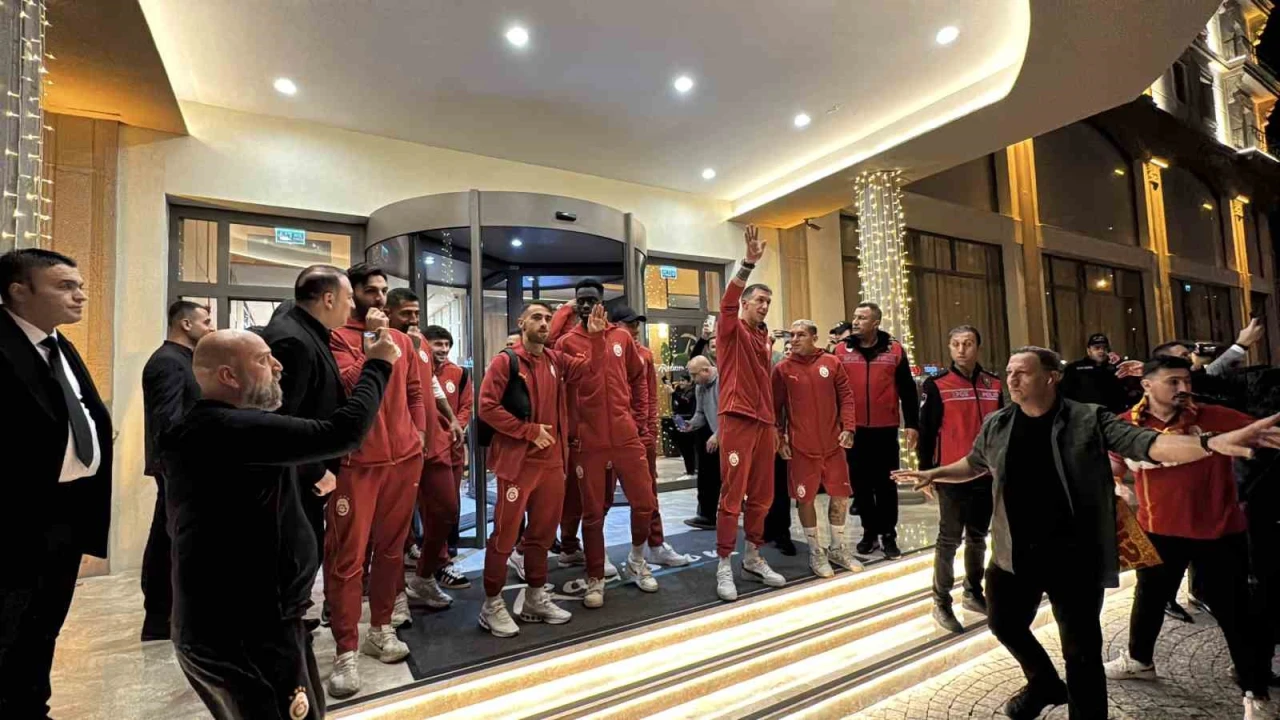 Kafilenin otele girmesinin ardından girişte bekleyerek slogan atan taraftarlar, takımı dışarı çağırdı. Bir süre sonra otelin önüne inen sarı-kırmızılı futbolcular ise taraftarları selamlayarak üçlü çektirdi.