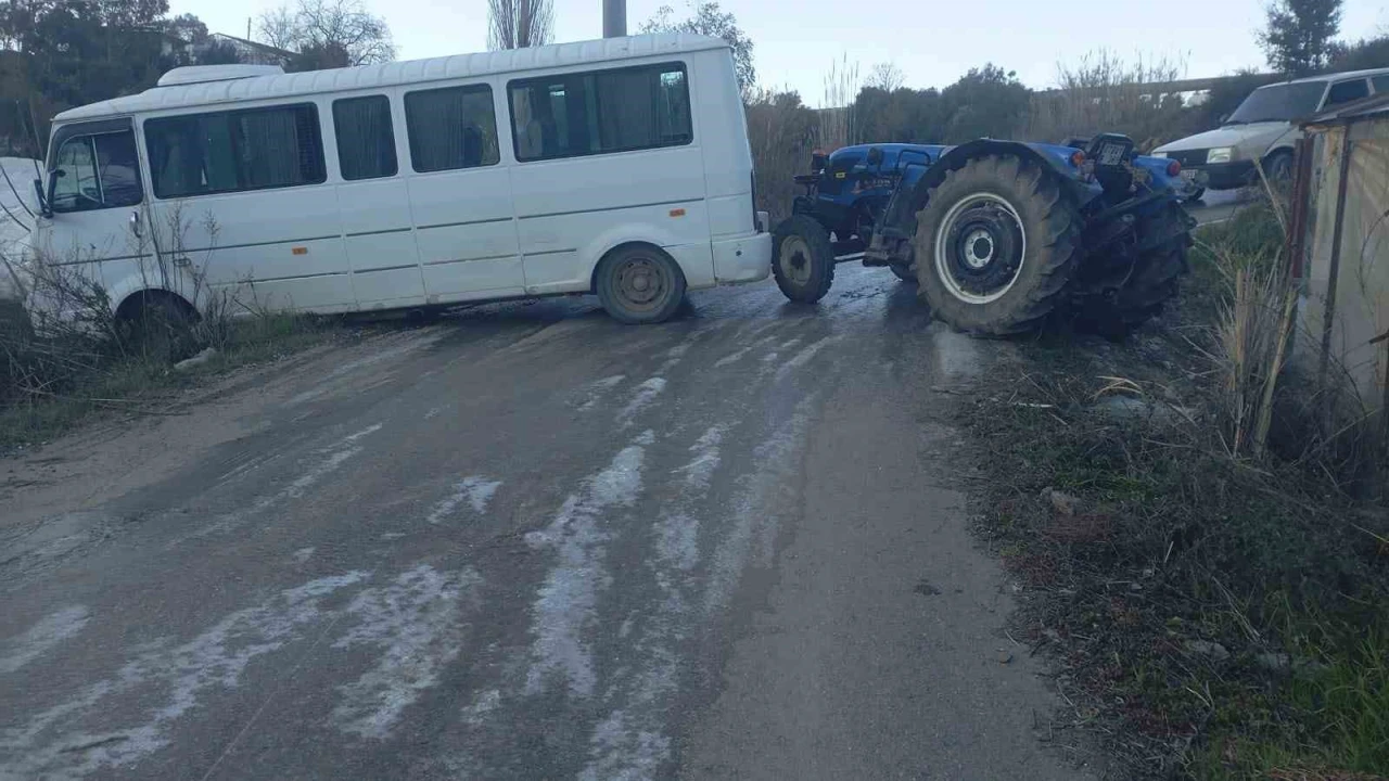 Devrilme tehlikesi atlatan okul servisini kurtarmak için olay yerine bir traktör çağrıldı. Ancak buzlu zeminde kayganlaşan yol, traktörün de mahsur kalmasına neden oldu. Bunun üzerine bölgeye çağrılan 4x4 bir başka traktör hem servisi hem de yolda kalan traktörü kurtardı.