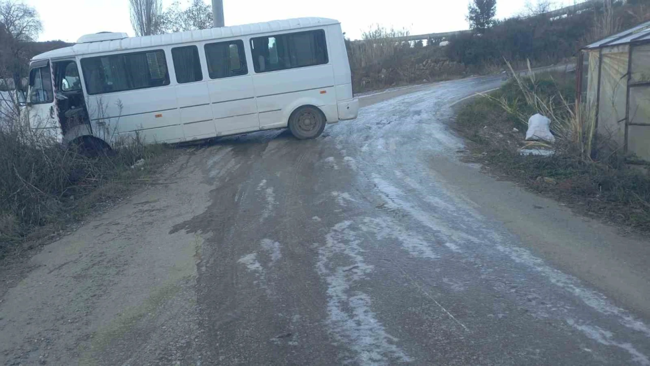 Olay, sabah saat 07.20 sıralarında Hasdere Mahallesi’nde yaşandı. Erhan Taşdemir’in kullandığı Karsan marka okul servisi, yolda oluşan buzlanma nedeniyle kontrolden çıkıp, yan şekilde kayarak devrilme tehlikesi atlattı. Sürücü, aracın ön lastiklerini yol dışına çıkararak aracı durdurmayı başardı. Serviste bulunan 3 lise öğrencisi, kazayı yara almadan atlattı. Öğrenci velilerini arayan sürücü çocukları güvenli bir şekilde ailelerine teslim etti.