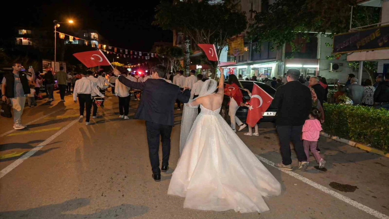 Demre’de dün akşam Cumhuriyet’in 102. yıl dönümü kutlamaları çerçevesinde düzenlenen fener alayında sıradışı görüntüler yaşandı. Ellerinde bayraklar ve meşalelerle vatandaşlar, bayram coşkusunu Demre sokaklarına taşıdı. Düğünleri olan Gülsüm Görgülü ve Bayram Kıvrak çifti ise, gelinliği ve damatlığıyla Cumhuriyet coşkusunu paylaşmak için yürüyüşe katıldı. Vatandaşların ve izleyicilerin ilgisini çeken çift, Cumhuriyet Meydanı’ndan başlayıp Noel Baba Meydanı’nda son bulan kortej boyunca halkla birlikte yürüdü. Fener alayının ardından çift, düğün salonuna geçip nikahlarını kıydırdı.