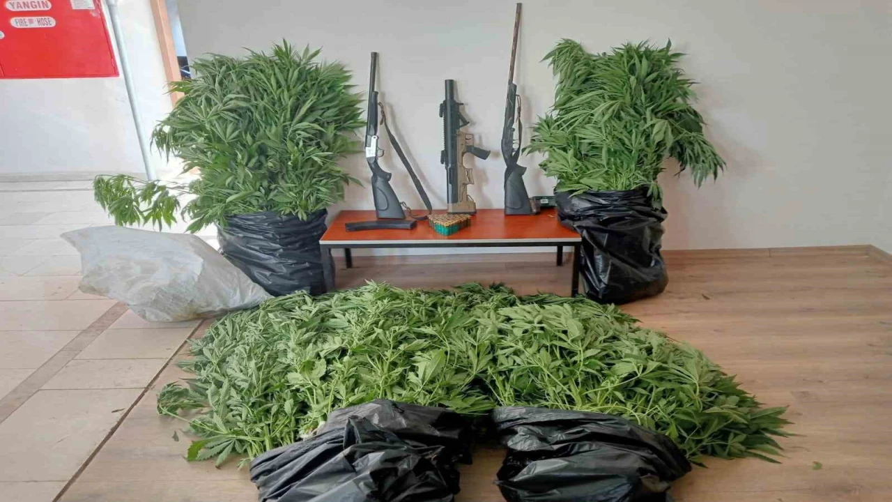 YAPILAN ARAMADA 48 METREKARE GENİŞLİĞİNDE ÇAMURLA SIVANMIŞ SERA İÇERİSİNE KURULAN BAHÇEDE 201 KÖK HİNT KENEVİRİ İLE 3 ADET RUHSATSIZ TÜFEK ELE GEÇİRİLMİŞTİ