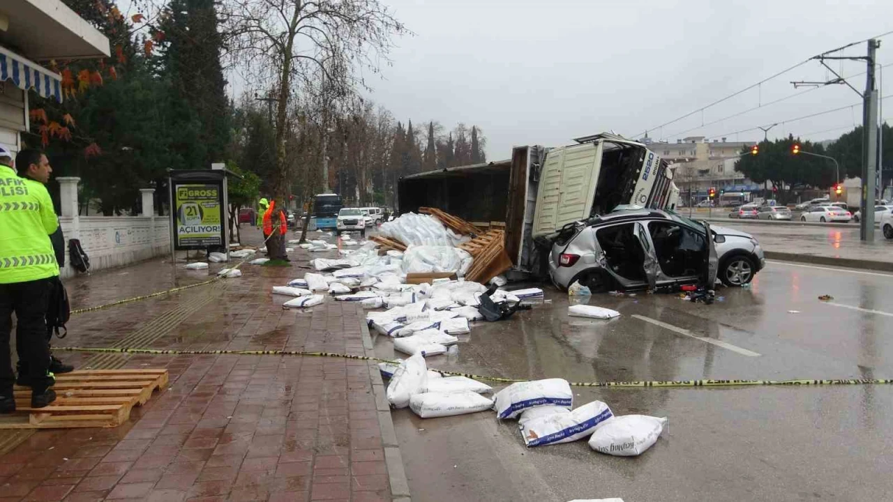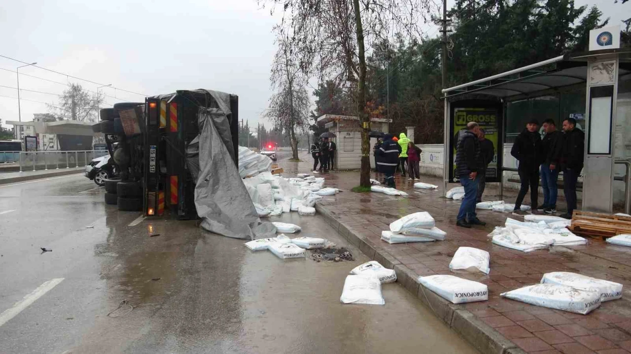 Kaza, Kepez ilçesi Varsak Mahallesi Süleyman Demirel Bulvarı’nda saat 08.30 sıralarında meydana geldi. Edinilen bilgiye göre, Şahin K. yönetimindeki 15 EH 517 plakalı gübre taşıyan kamyon, kavşakta Gülşen S.’nin kullandığı 07 MKB 45 plakalı Dacia marka otomobille çarpıştı, ardından park halindeki 07 AU 0336 plakalı VS 18 hat numaralı belediye otobüsüne çarpıp devrildi.