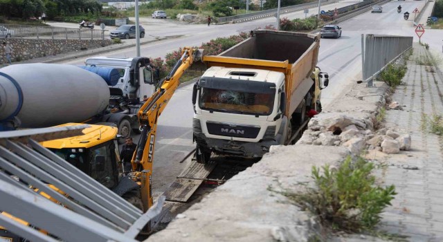 HATAY’DA YOLA DÖKÜLEN SIVININ ETKİSİYLE SÜRÜCÜSÜNÜN DİREKSİYON HAKİMİYETİNİ KAYBETTİĞİ HAFRİYAT KAMYONUN 5 METRELİK DUVARDAN UÇTUĞU ANLAR KAMERAYA YANSIDI.