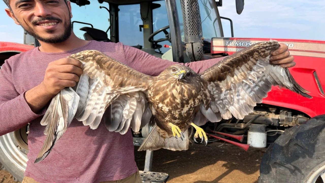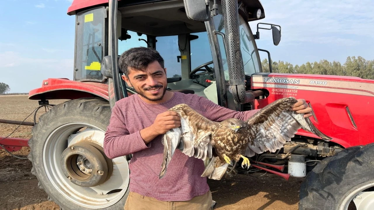 Adana’nın Ceyhan ilçesinde yer fıstığı hasadı yapan bir çiftçi, tarlada uçamayan bir şahin görünce hasadı bırakıp onun yardımına koştu.