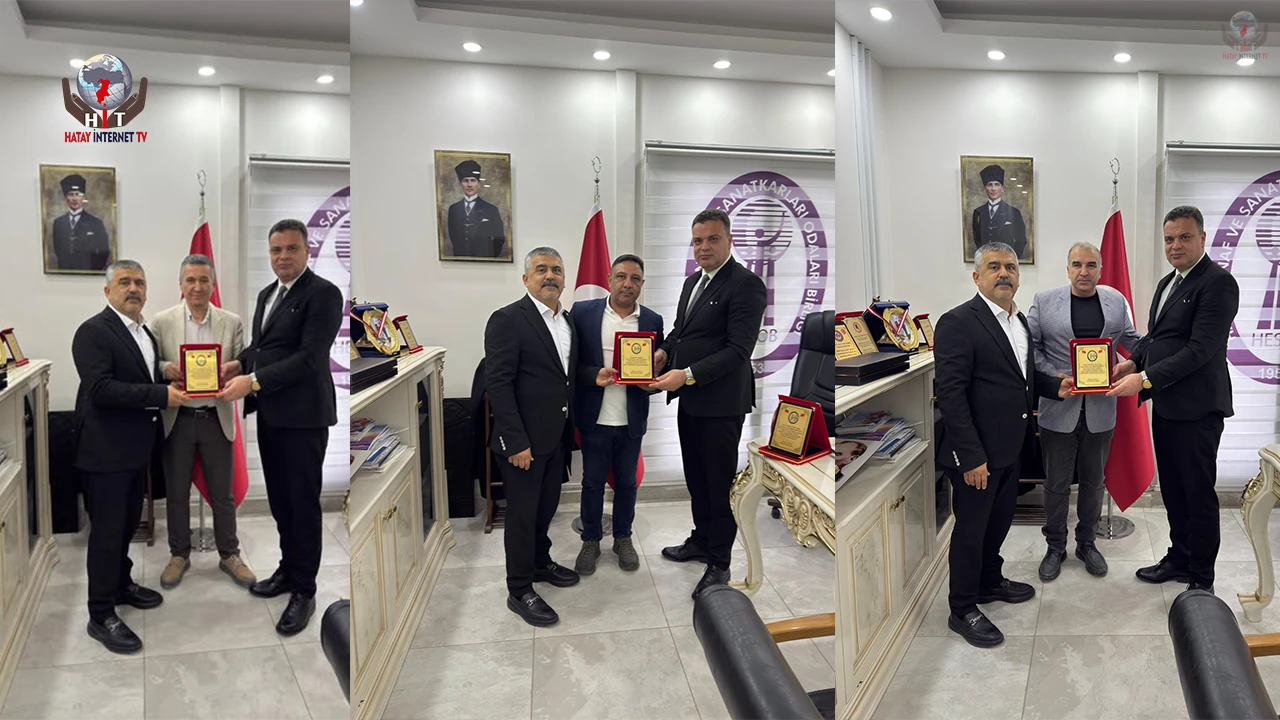Hatay Esnaf ve Sanatkârları Odaları Birliği’nde gerçekleştirilen törende, deprem sonrası esnaf ve sanatkârların sorunlarının çözümü, mesleki sicil işlemleri ve eğitim faaliyetlerinin sürdürülebilirliği adına büyük özveriyle çalışan isimler onurlandırıldı. Birlik Genel Sekreteri Bülent Bilgin, Sicil Müdürü Remzi Öğütalan ve Eğitim Müdürü Rasim Berber’e plaketleri takdim edildi.