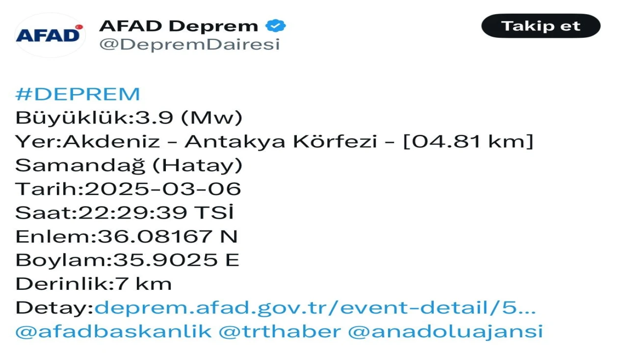 Depremle ilgili açıklama yapan Hatay Valiliği, "AFAD Başkanlığı Deprem Daire Başkanlığı'ndan alınan bilgi doğrultusunda Samandağ / Akdeniz-Antakya Körfezi (Hatay) merkezli 3.9 büyüklüğünde deprem meydana gelmiş olup, ilk belirlemelere göre olumsuz bir durum olmayıp, 112 Acil Çağrı Merkezine herhangi bir ihbar gelmemiştir.
