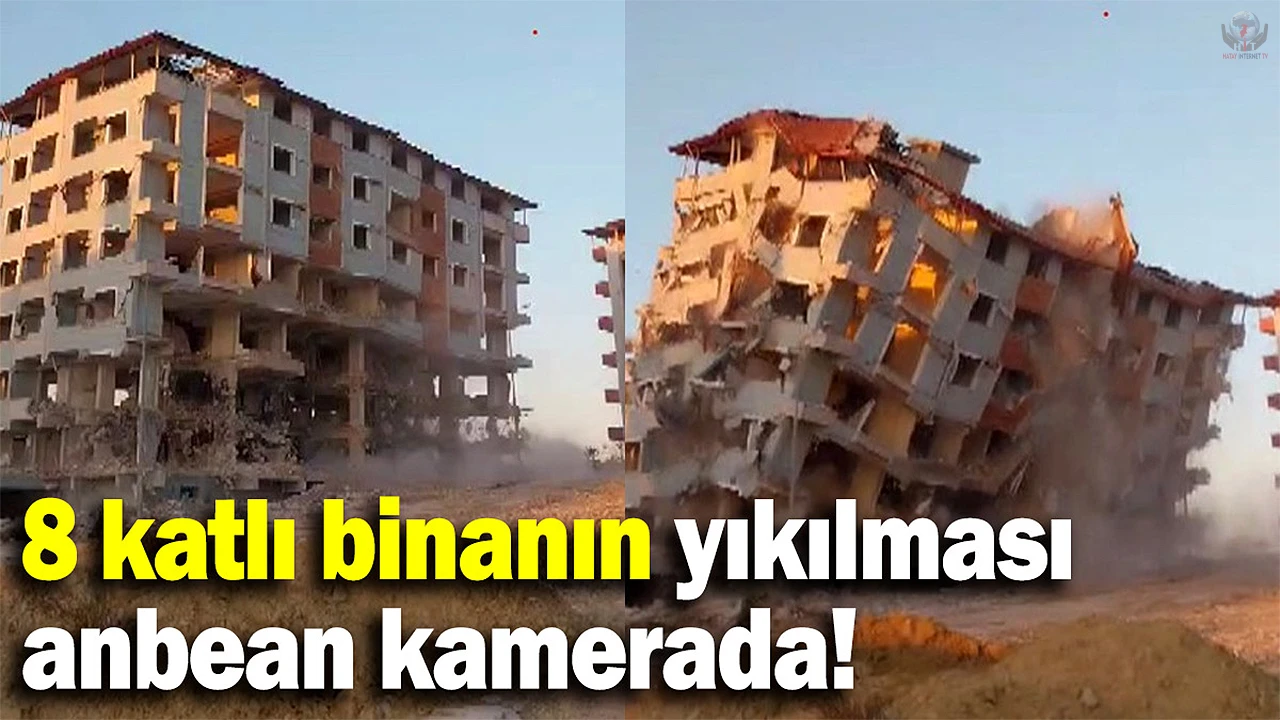 ANTAKYA İLÇESİNDE 8 KATLI BİNANIN İŞ MAKİNESİNİN DARBESİYLE KONTROLLÜ OLARAK YERLE BİR OLDUĞU ANLAR KAMERAYA YANSIDI