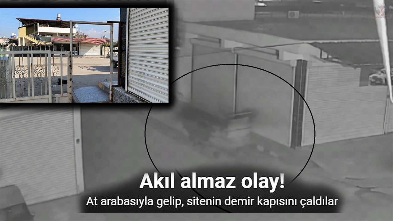 HATAY (İHA) - Hatay’da at arabalı hırsızların galericiler sitesine ait demir kapıyı çaldıkları anlar güvenlik kamerasına yansıdı.