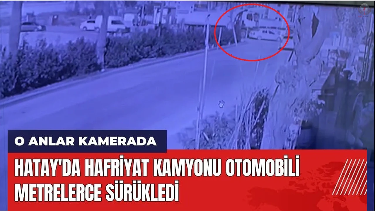 HATAY’IN ANTAKYA İLÇESİNDE HAFRİYAT KAMYONUNUN OTOMOBİLİ METRELERCE SÜRÜKLEDİĞİ ANLAR İŞYERİ GÜVENLİK KAMERASINA YANSIDI.