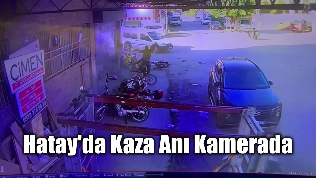 HATAY'DA BİR SÜRÜCÜSÜ, DİREKSİYON HAKİMİYETİNİ KAYBEDEREK İŞ YERİNİN ÖNÜNDE DURAN MOTOSİKLETLERE ÇARPTI. KAZA YAPAN GENÇ AKLINA BİLE GELMEDİ, HASAR ALAN MOTORUNA KOŞTU O ANLARSA KAMERAYA YANSIDI.