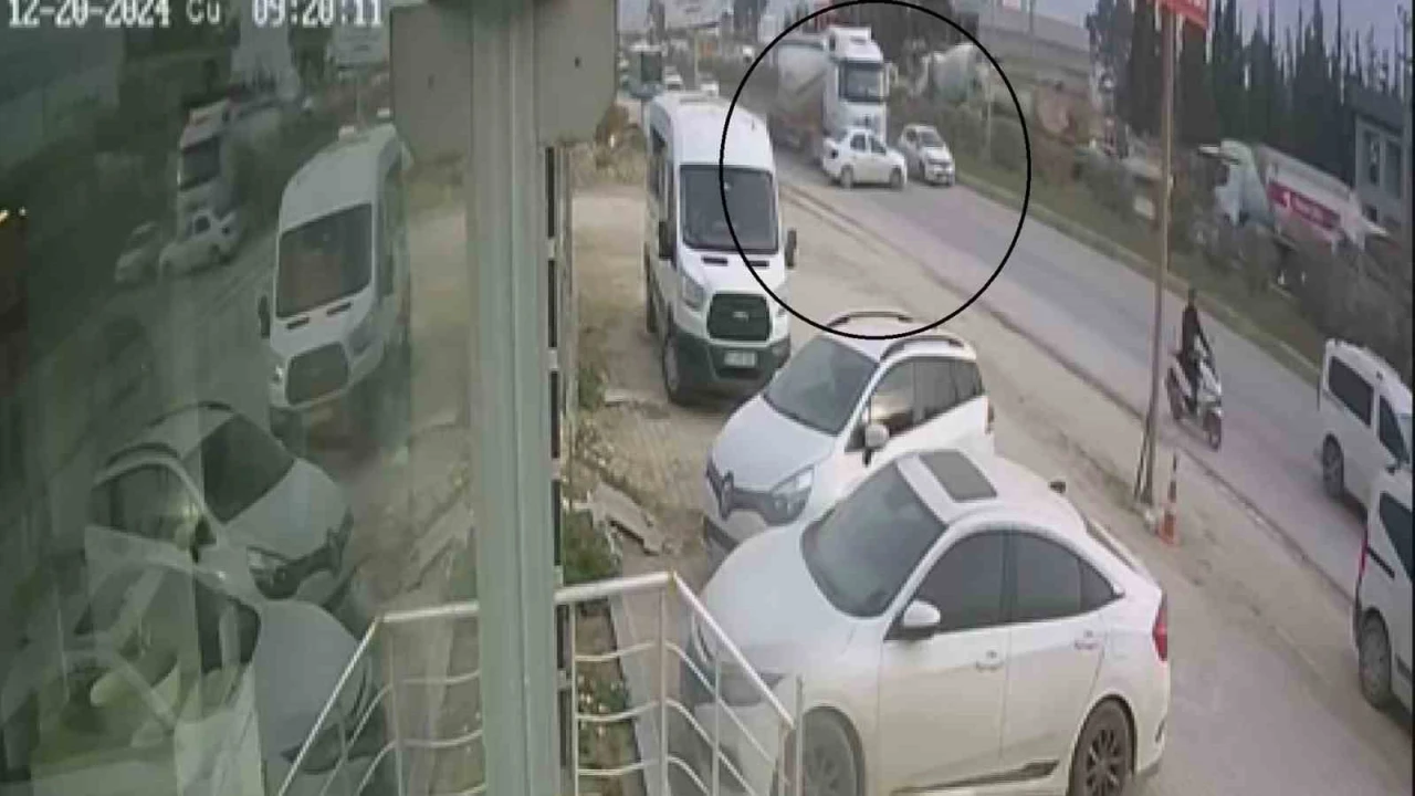 HATAY (İHA) - Hatay'da beton mikserinin önüne kattığı otomobili metrelerce sürüklediği korku dolu anlar güvenlik kamerasına yansıdı.