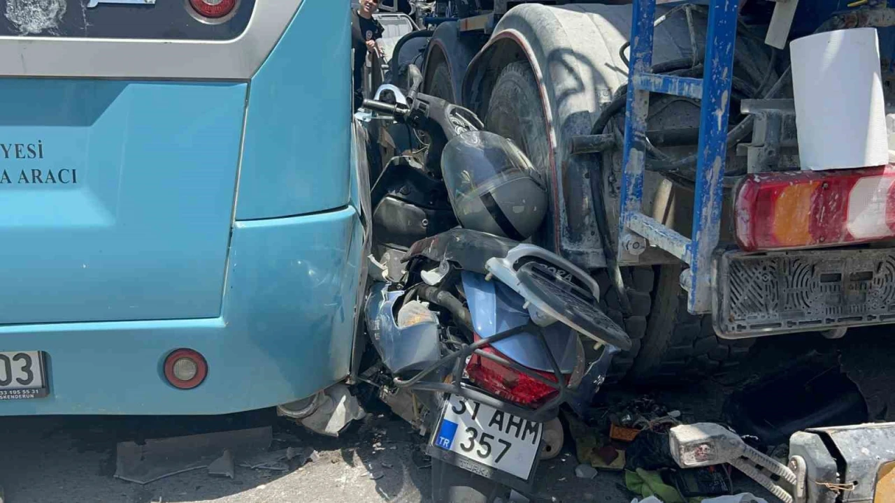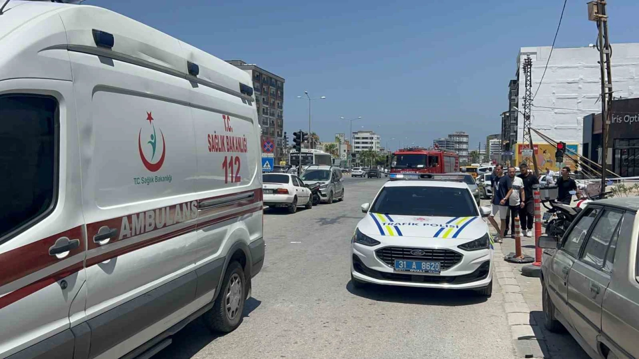 Kaza, İskenderun ilçesi Numune Evler Mahallesi’nde meydana geldi. Aynı yönde giden 31 TK 947 plakalı beton mikseri ile 31 HO 8503 plakalı minibüs arasında kalan 31 AHM 357 plakalı K.K. adlı motosiklet sürücüsü yaralandı.