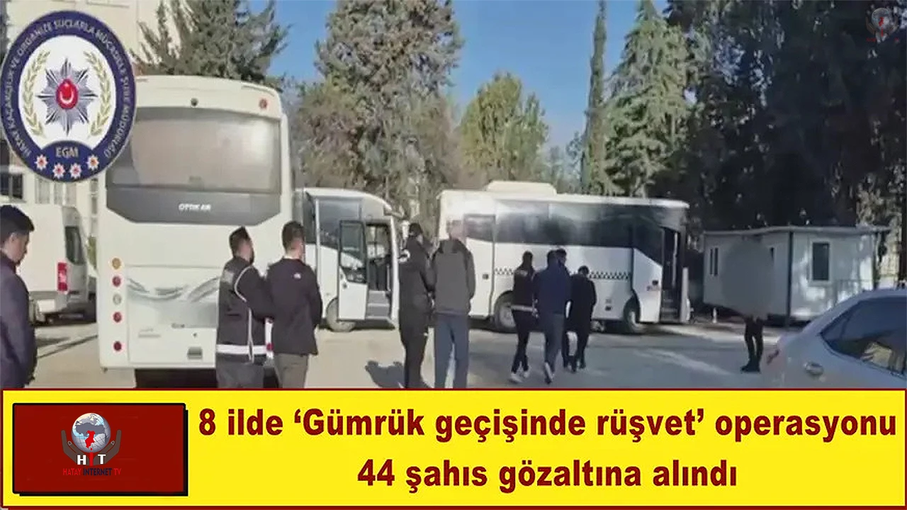 HATAY MERKEZLİ 8 İLDE GERÇEKLEŞTİRİLEN ‘GÜMRÜK GEÇİŞİNDE RÜŞVET’ OPERASYONUNDA ÇOK SAYIDA MEMUR BAŞTA OLMAK ÜZERE 44 ŞAHIS GÖZALTINA ALINDI. HATAY POLİSİNİN DETAYLI ÇALIŞMALARIYLA ORTAYA ÇIKAN RÜŞVET ÇARKINDA; MEMURLARIN İNTERNET TABANLI PROGRAMLAR BAŞTA OLMAK ÜZERE TELEFONLA KURDUKLARI İLETİŞİMLERDE ŞİFRELİ GÖRÜŞTÜKLERİ, HER YENİ YILIN BAŞINDA GEÇİŞ ÜCRETLERİNE ZAM YAPTIKLARI VE ELDEN ALARAK TOPLADIKLARI RÜŞVETLERİ HAVUZ İÇERİSİNDE BİRLEŞTİREREK HER AY SONUNDA ELDE ETTİKLERİ HAKSIZ KAZANCI PAYLAŞTIKLARI ORTAYA ÇIKTI.