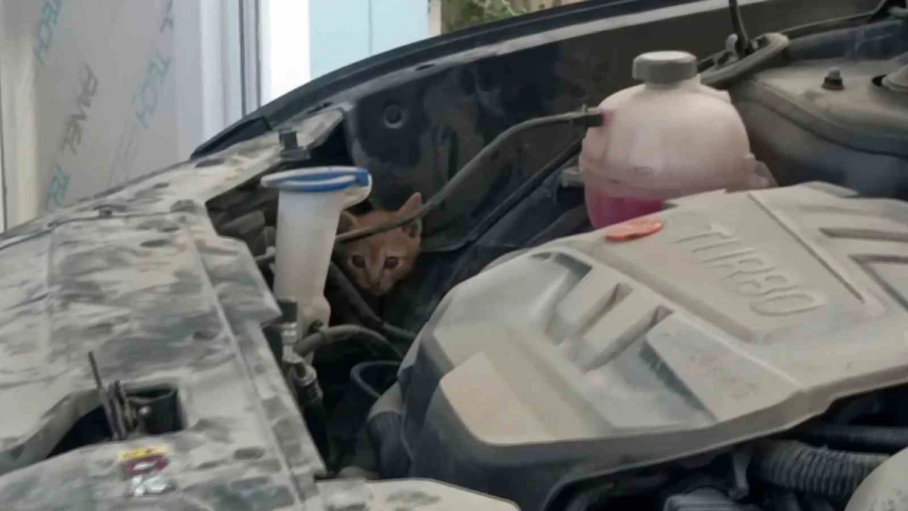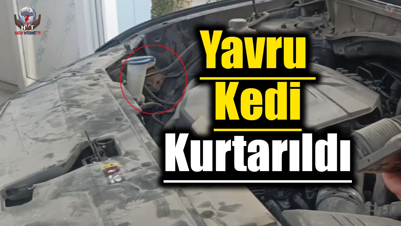 Hatay’da park halindeki bir aracın motor kısmına giren yavru kedi, telefondan açılan miyavlama sesiyle çıkartıldı.