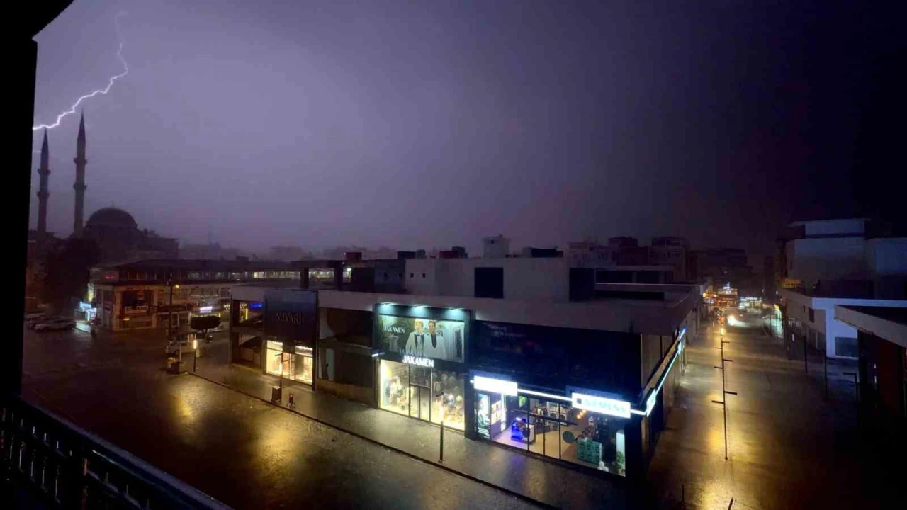 Yağışlı havayla birlikte yollar göle dönerken, şimşekler geceyi aydınlattı.