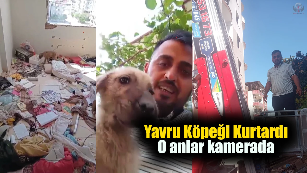 Ağır hasarlı binaya asansörlü nakliye aracıyla çıkıp, yavru köpeği kurtardı: O anlar kamerada