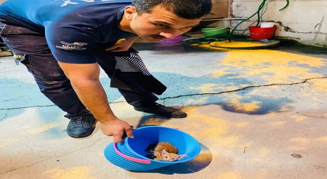 Hatay’da havalandırma boşluğunda mahsur kalan kediyi itfaiye kurtardı.