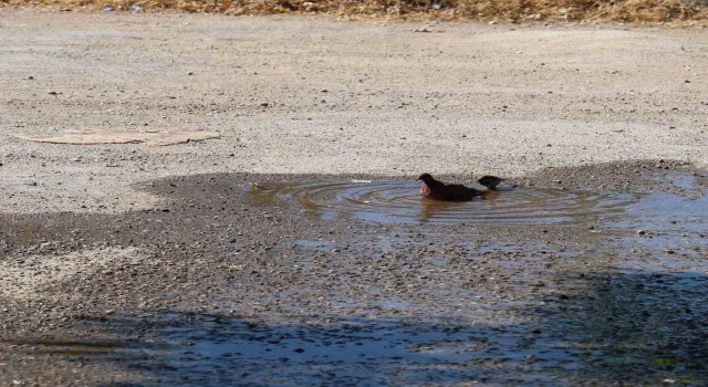 MİNİK BİRİKİNTİLERİNDE SU İÇİP SERİNLEYEN KUŞLARIN GÖRÜNTÜSÜ KAMERAYA YANSIDI.
