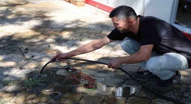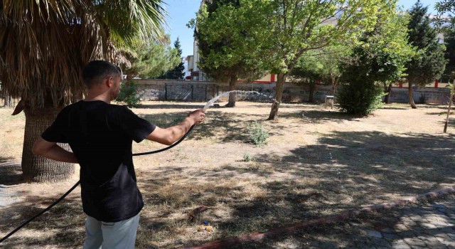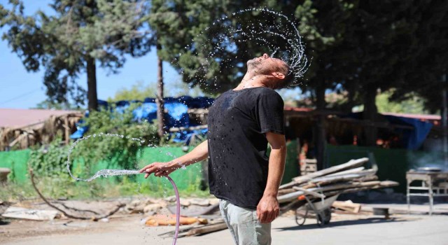 Kahramanmaraş’ta sıcaktan bunalan bir vatandaş eline aldığı hortum ile hem doğadaki kuşları hem de kendini serinletti.