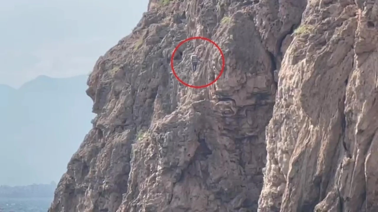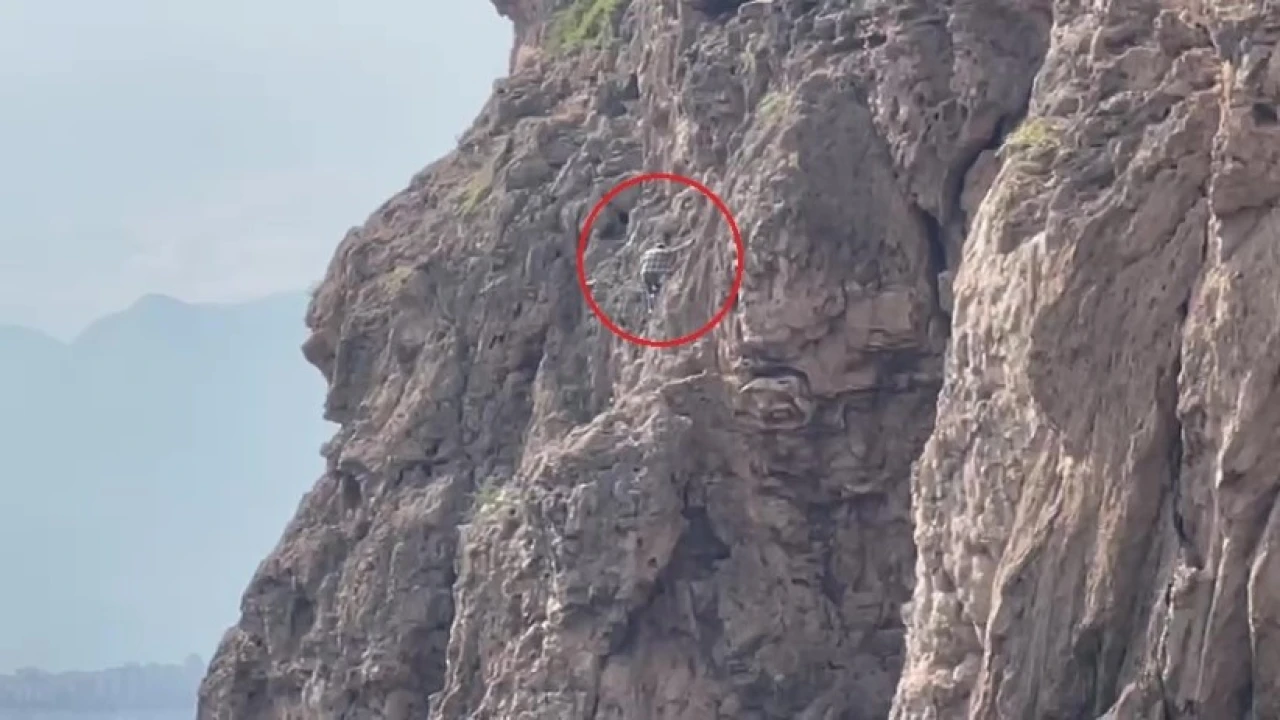 ANTALYA'DA BİR KİŞİNİN YAKLAŞIK 30 METRELİK SARP KAYALIKLARDAN OLUŞAN FALEZLERİN ORTA KISMINDA GÖREN BİR VATANDAŞLAR ŞAHSIN MAHSUR KALDIĞINI DÜŞÜNDÜ