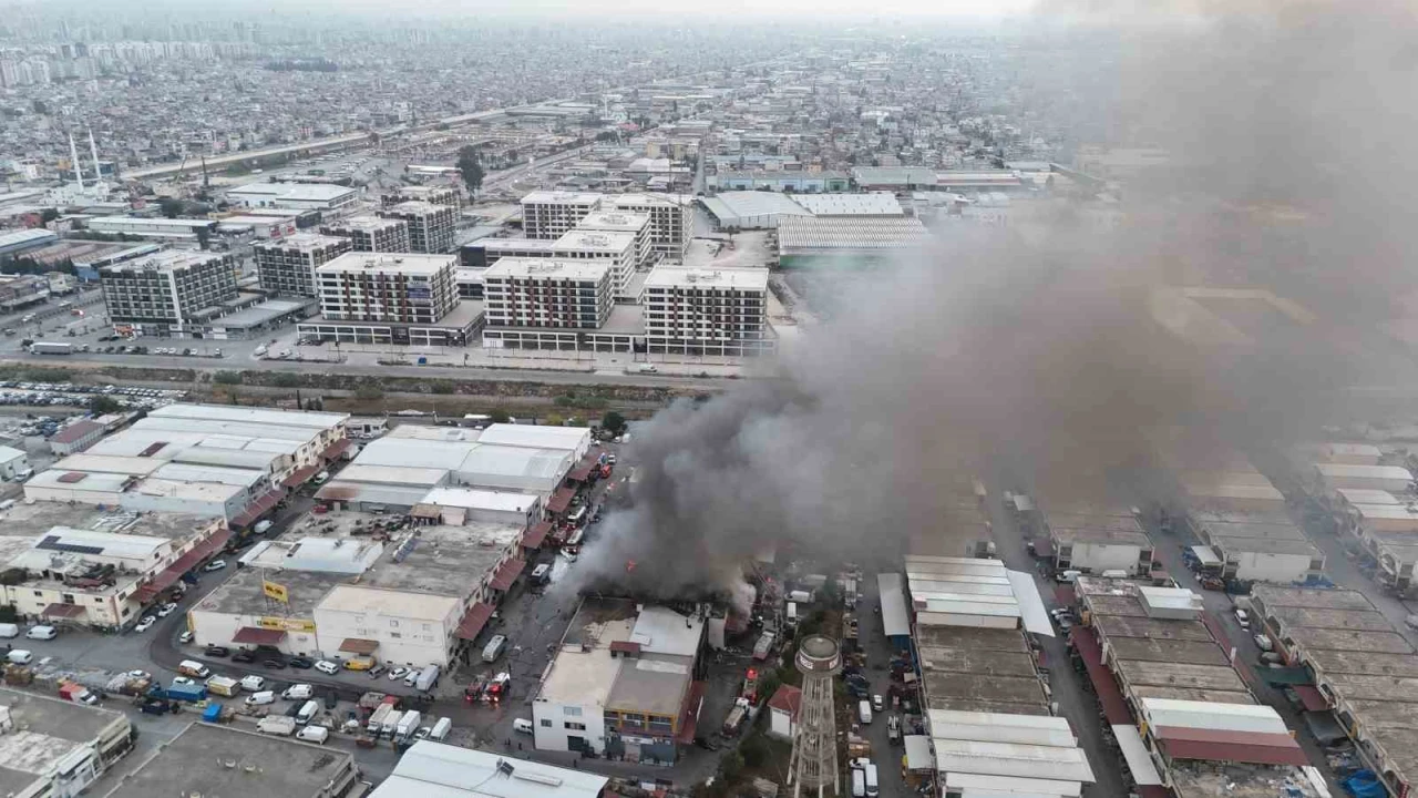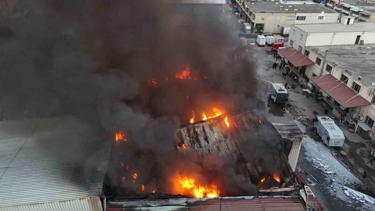 Adana’da hırdavat dükkanında çıkan yangın söndürülmeye çalışılırken yangın, dron ile havadan görüntülendi.