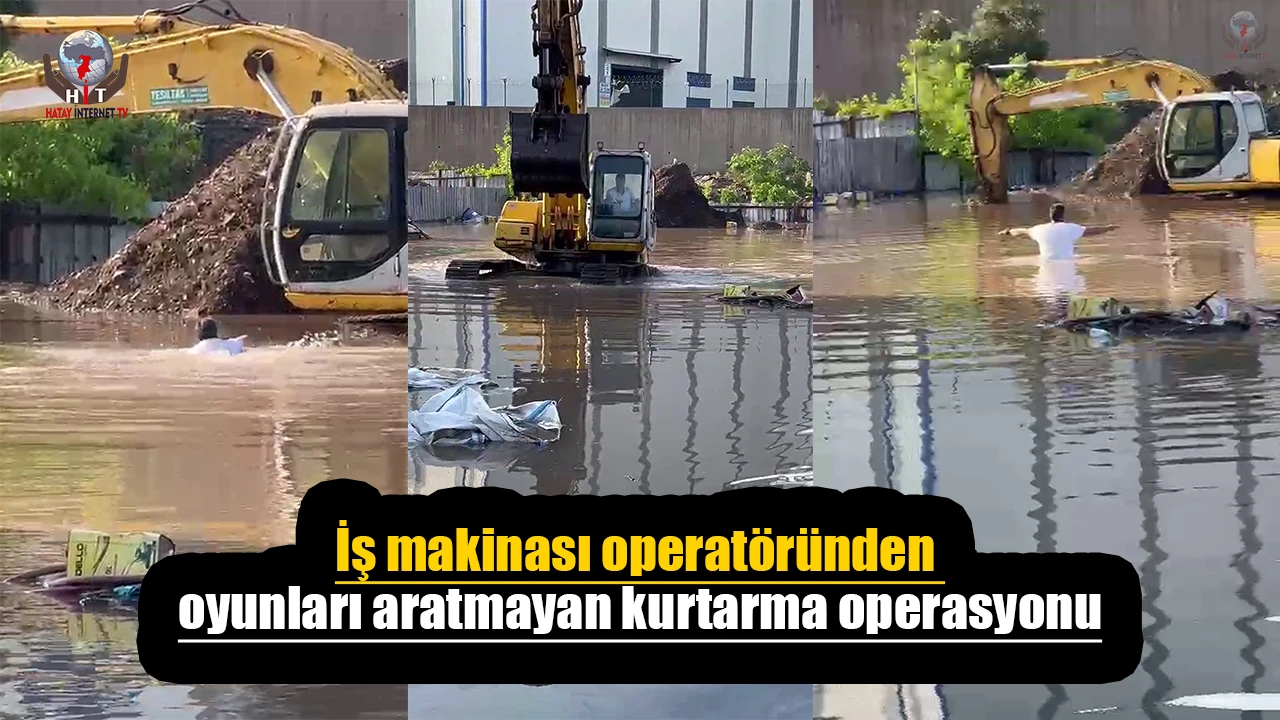 Hatay’da gece saatlerinde etkili olan yağışla birlikte şantiye alanında suya gömülen iş makinası, operatörünün yüzerek ulaşmasıyla kurtarıldı.
