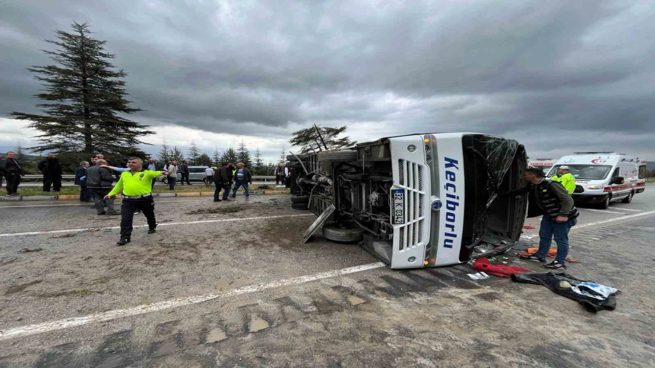Isparta-Afyonkarahisar karayolunda kontrolden çıkan yolcu midibüsünün refüjü aşarak devrildiği kazada 15 kişi yaralandı.