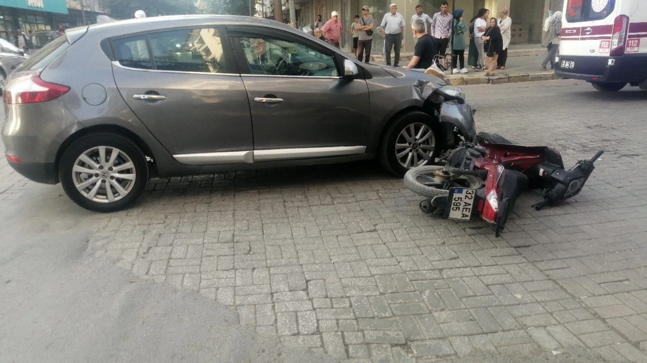 Kaza, Yalvaç ilçesi Çarşı Mahallesi’nde meydana geldi. Edinilen bilgiye göre, F.Y. idaresindeki 07 BED 828 plakalı otomobil ile B.Ç. hakimiyetindeki 32 AEA 595 plakalı motosiklet çarpıştı. Çevredekilerin ihbarı üzerine bölgeye polis ve sağlık ekipleri sevk edildi. Olay yerine gelen sağlık ekiplerinin ilk müdahalesinin ardından yaralı motosiklet sürücüsü ambulansla hastaneye kaldırıldı. Hastaneye kaldırılan B.Y.’nin sağlık durumunun iyi olduğu öğrenilirken kaza ile ilgili inceleme başlatıldı.